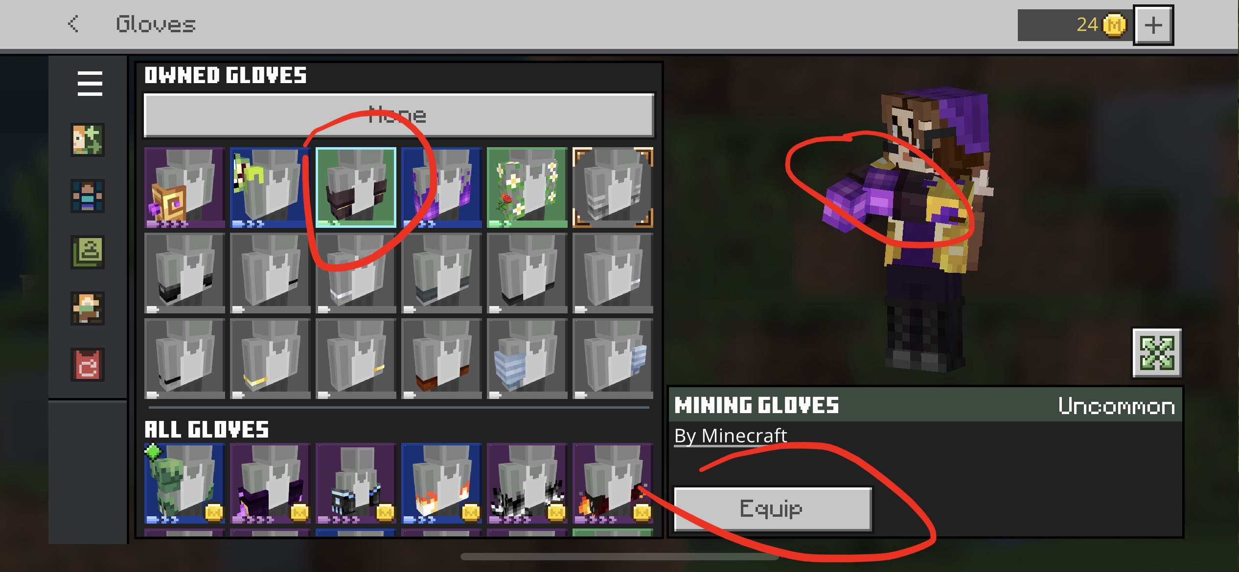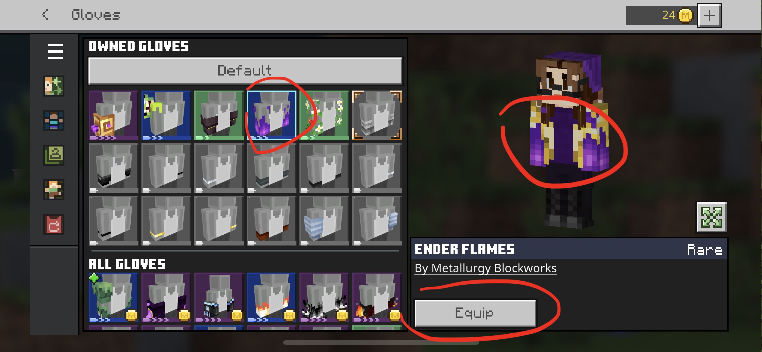 The moment I clicked on the ender flames gloves it has glitched all other gloves i have tried to equip. Even getting off the app and getting back on doesn’t fix it. Trying to equip the flames doesn’t help,when it get off the app and back on it stays on the ghast mage gloves. When I’m of a world the ender flames aren’t animated as well.