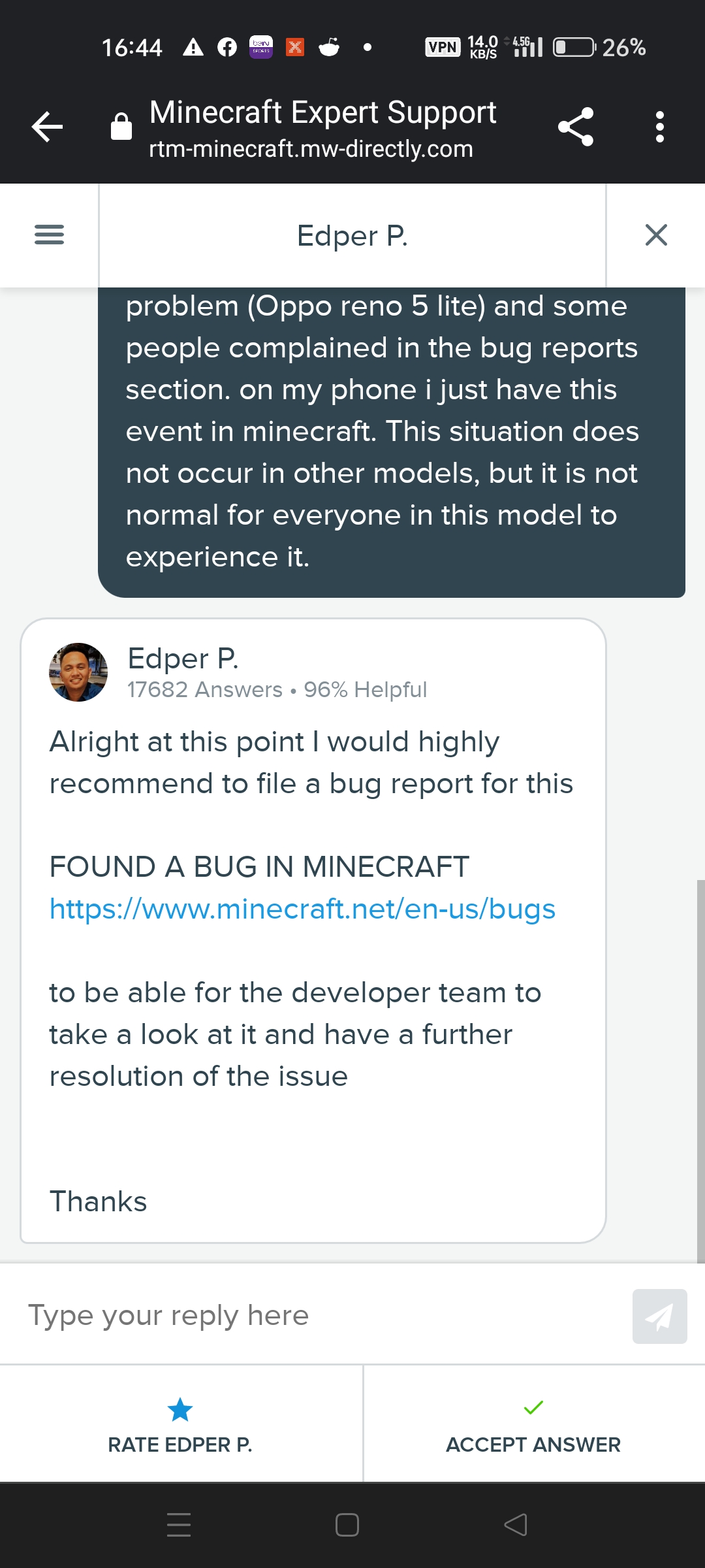 This is my second complaint you didn't solve in the first. I wrote to the minecraft support team and said, write a bug report again. please get it resolved. my phone is oppo reno 5 lite and after half an hour sometimes 10 minutes after entering the game, the game crashes (kicks the game) without any error. I looked at the comments of minecraft on google play store everyone in this model is complaining about it. it is not normal for everyone in this model to complain about minecraft crashing.please look my report.