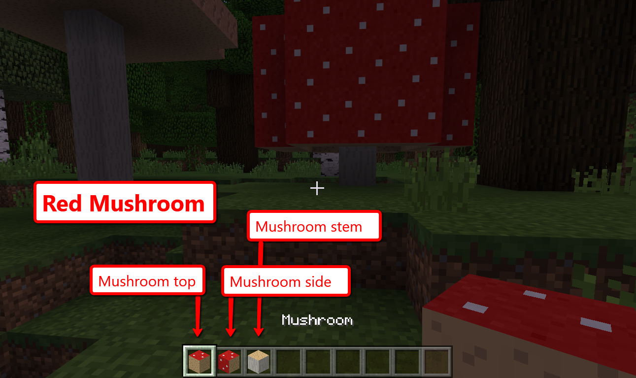 Large red mushrooms give you 3 unobtainable blocks when using middle click, a block for the top center of the mushroom, a block for the side of the mushroom and a block for the stem of the mushroom. (See photo attached)