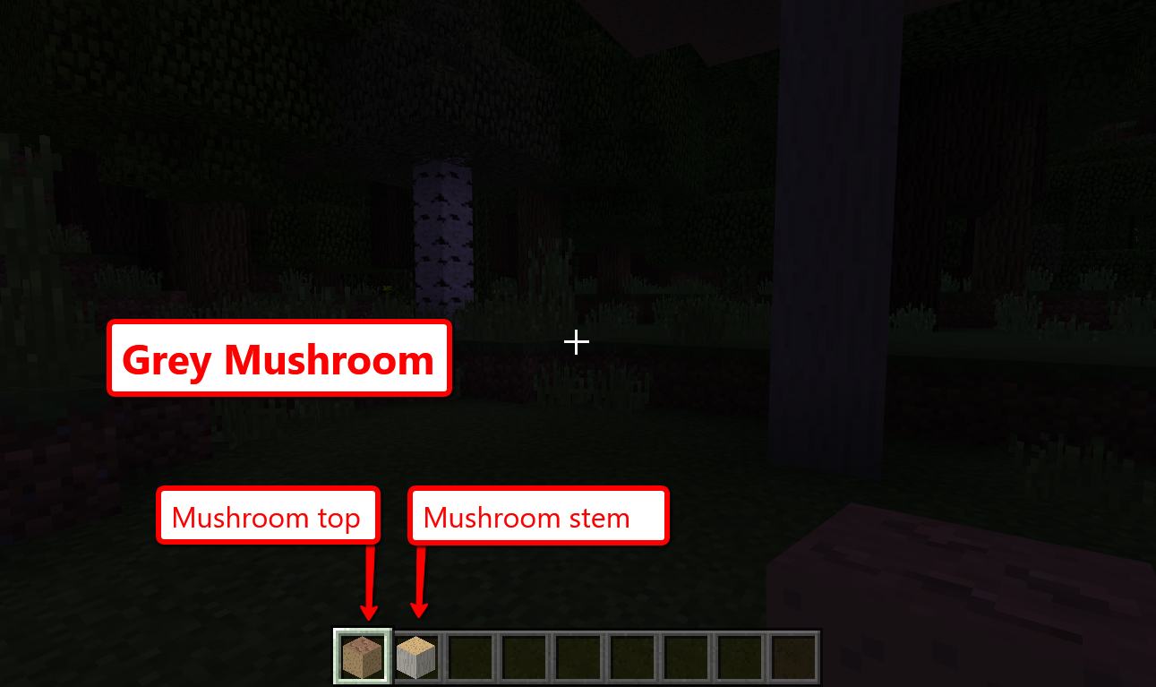 Grey mushrooms give you 2 unobtainable blocks when using middle click, a block for the top of the mushroom and a block for the side of the mushroom. (See additional photo)