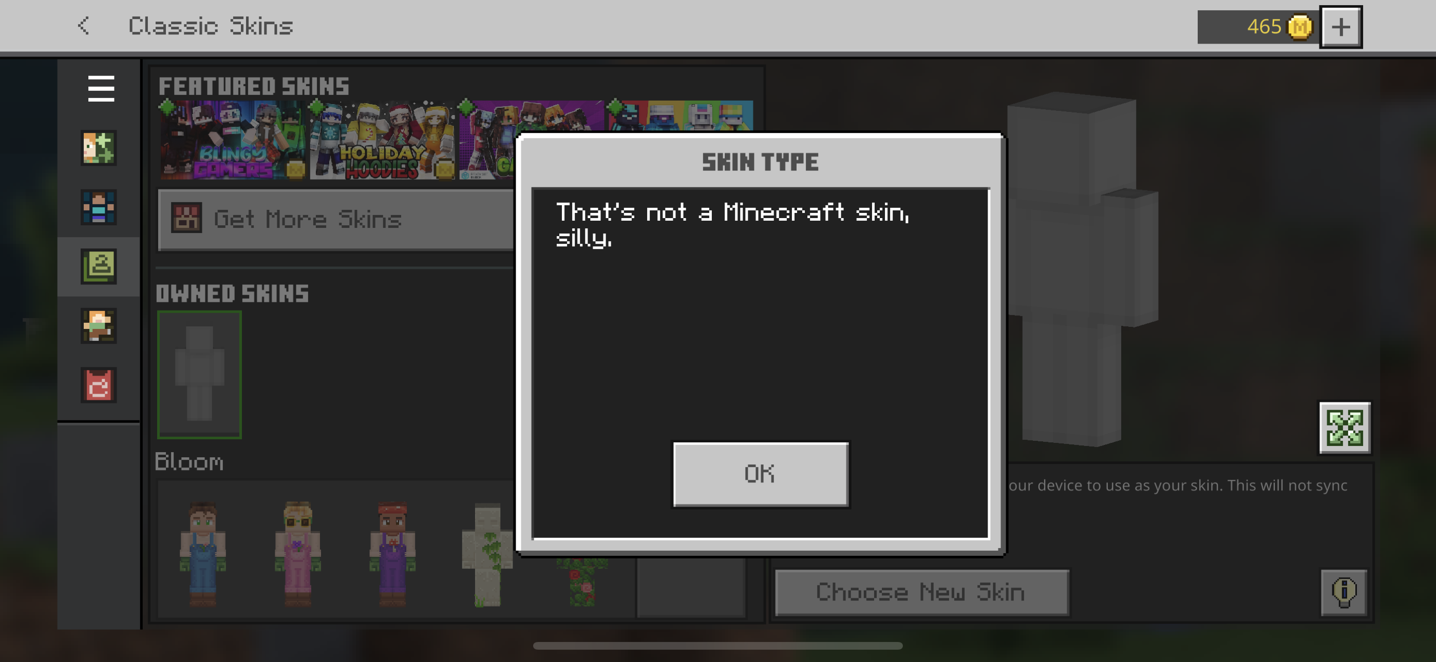 When you try and upload a custom skin from photos on an iPhone, the client rejects and says "This is not a Minecraft skin silly", even though it is. If I take that image and use it on Bedrock Windows 10 edition, it accepts it. I believe it happens on Xbox and Switch too, just not Win10.