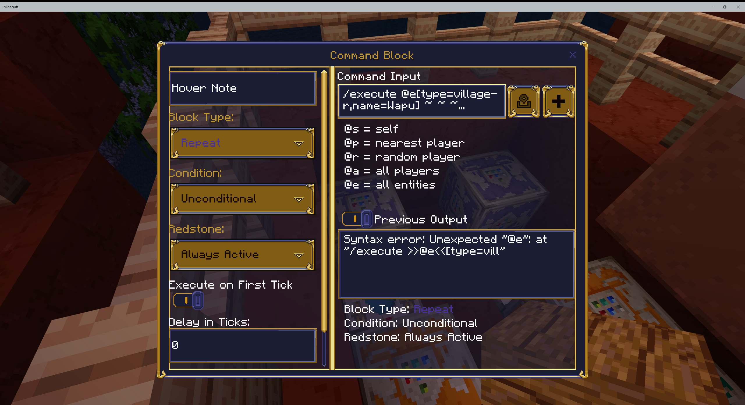 All of my command blocks where I have villagers talking now all say....syntax error @e.....so none of my adventure people are talking.