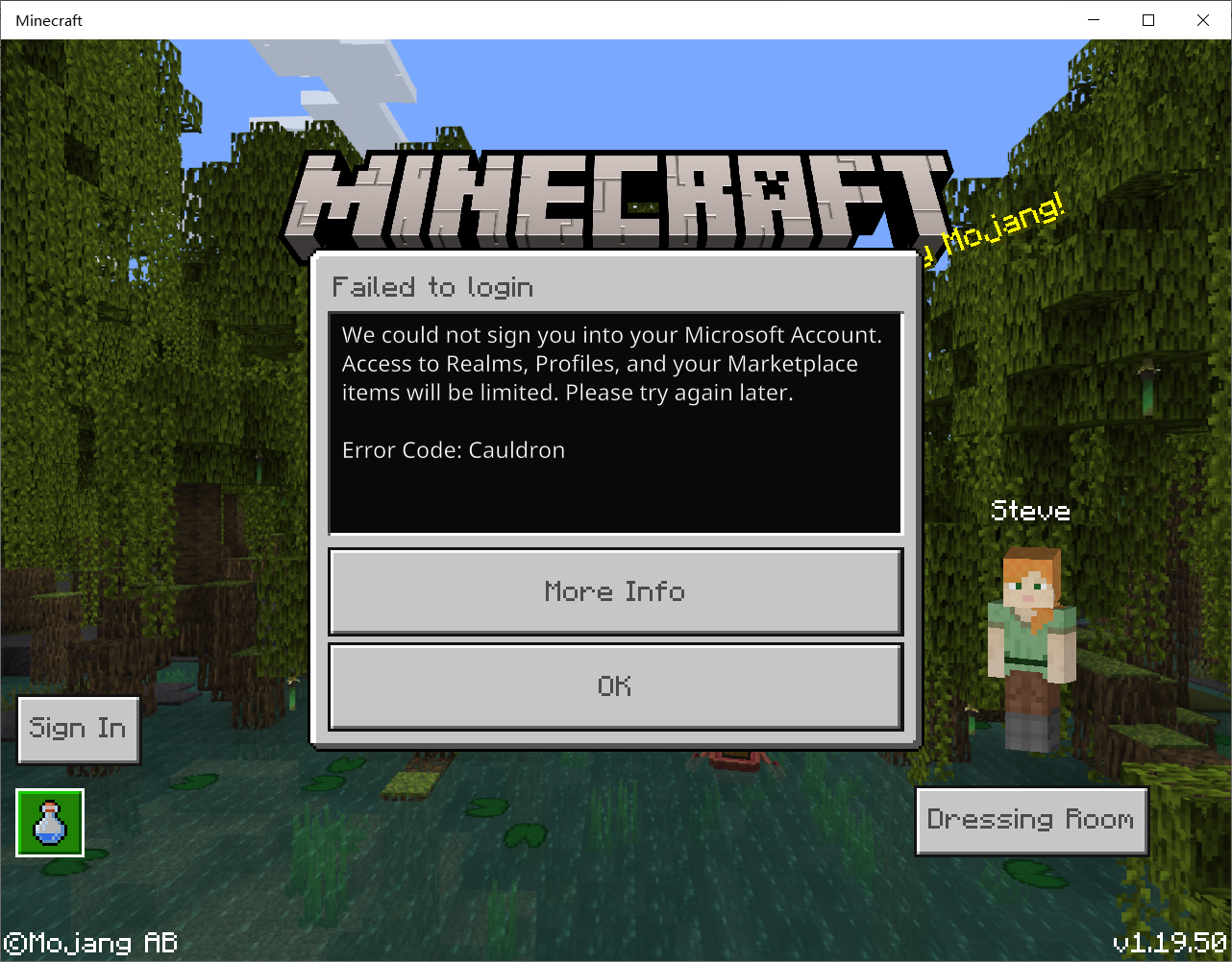 We could not sign you into your Microsoft account. Access to Realms, Profiles, and your Marketplace items will be limited. Please try again later.