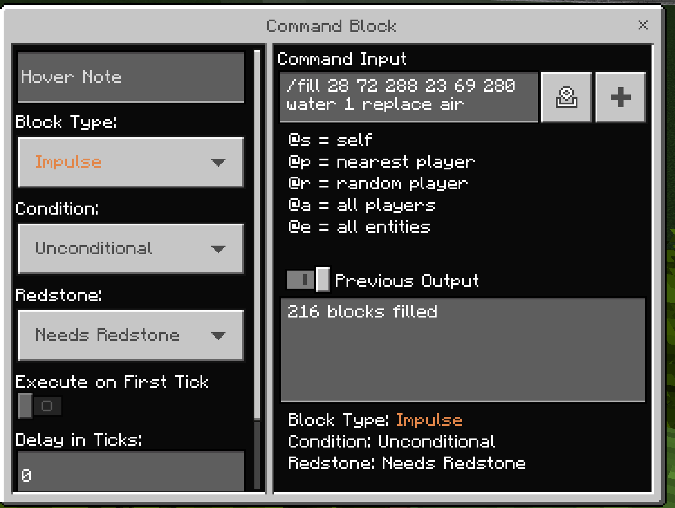 /fill ~~~ ~~~ water 0 replace airIf values higher than 0 are used, a non-source water block is created.
