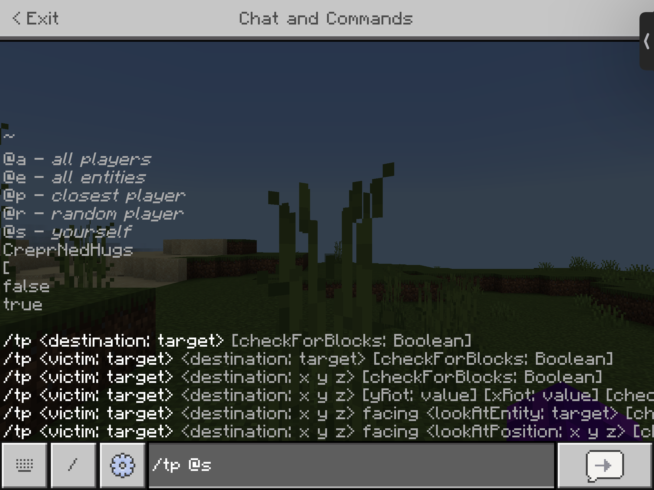 While using /tp or /teleport, the true and false Booleans show up on the autocomplete as options to use for the destination instead of only the checkForBlocks argument.