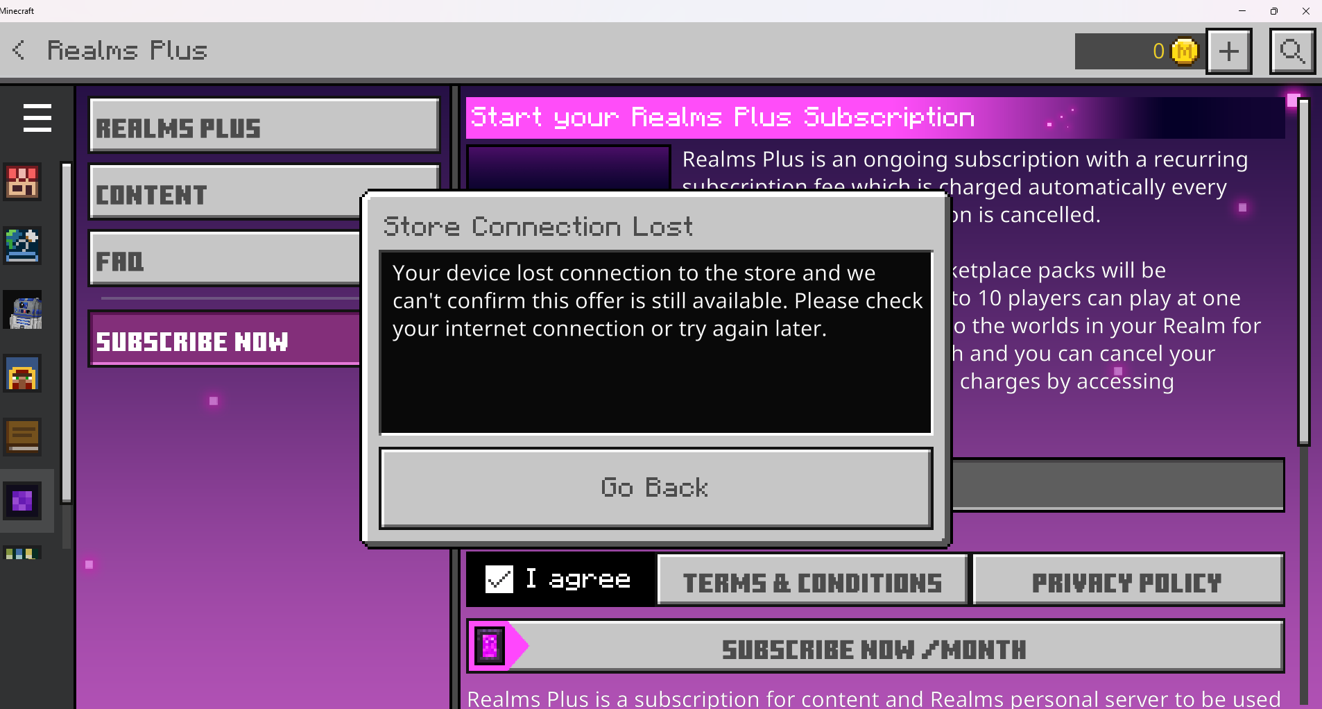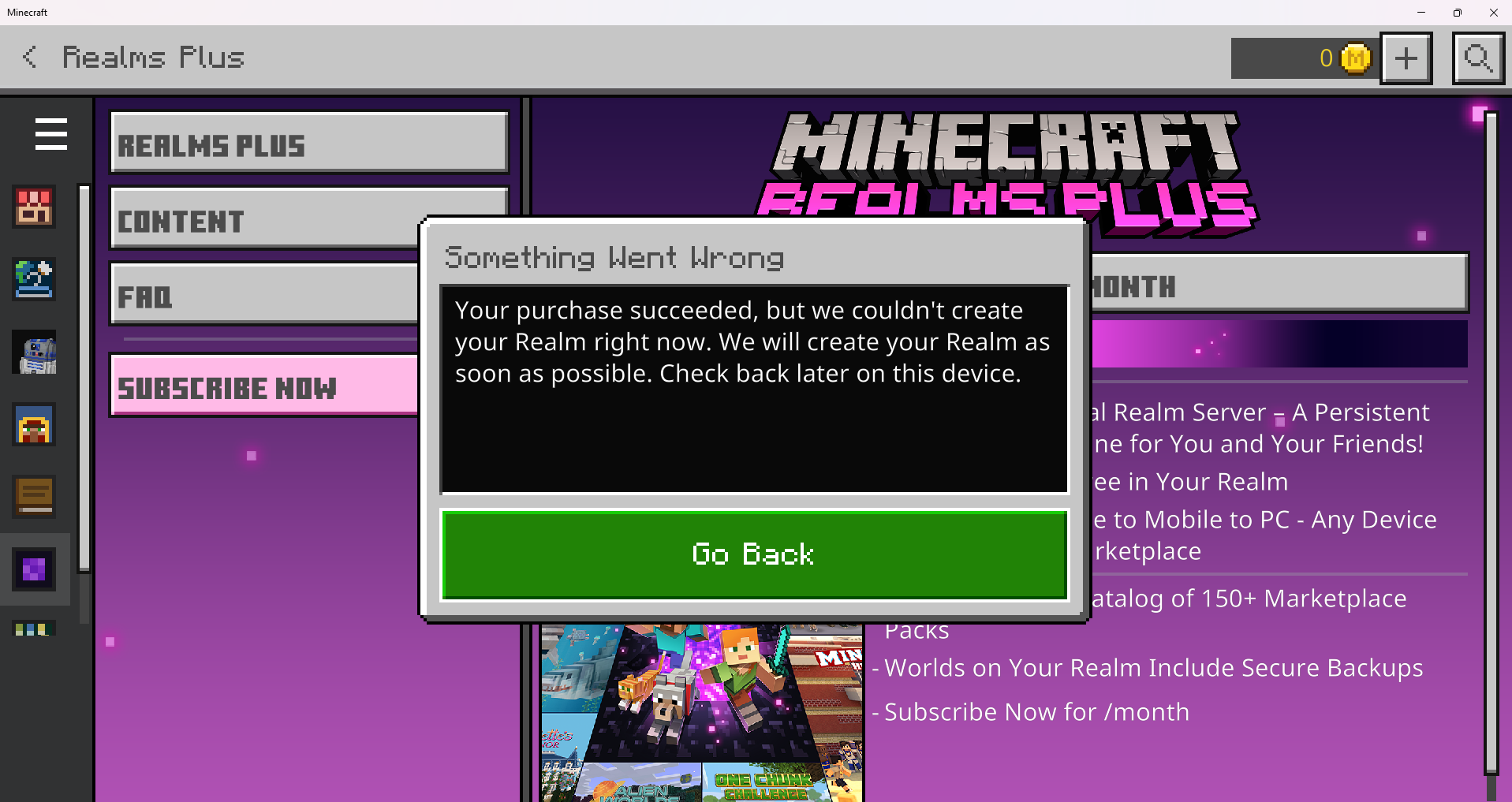 Recently I have been trying to make a realm to play with friends. I am using another account to make it but for some reason, I am having an issue where it will not let me make the realm due to either a "connection issue" or a "creation error". I am confused as to why this is happening as I have bought realms in the past on different accounts and never have had this issue. I have been restarting my computer and the Minecraft app multiple times while also trying different connections and still nothing.