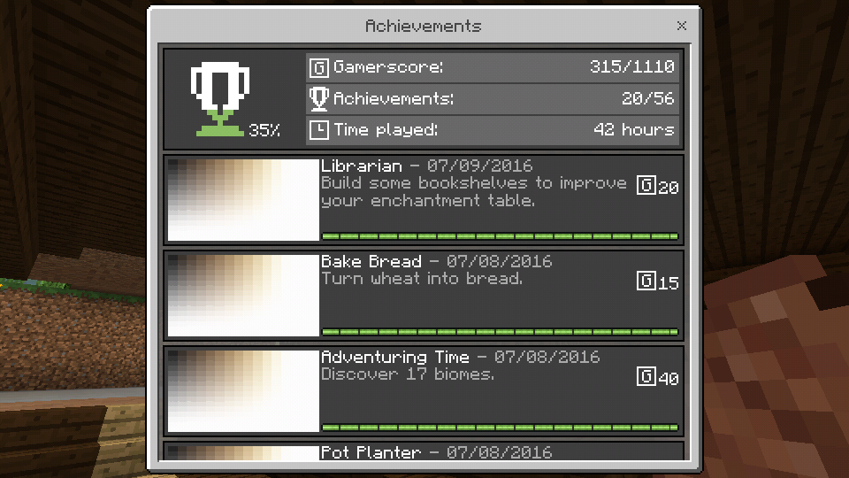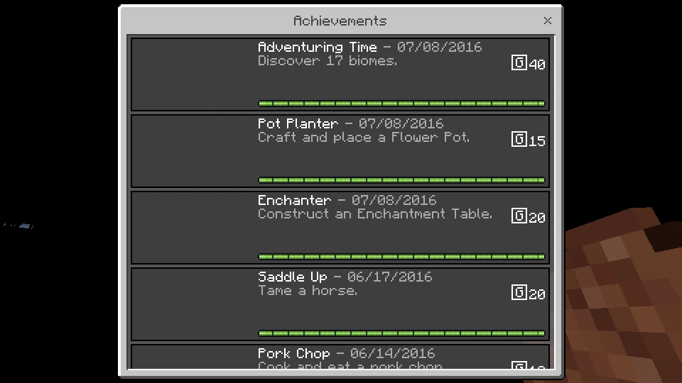 When I signed inn to the XBox, I couldn't see my archivement in menu. So I decided to play my world and watch the archivement. But in the game, the archivement look different (In picture) and when I drag it everything become black. I don't know have anyone report this bug yet. And sorry for my bad English