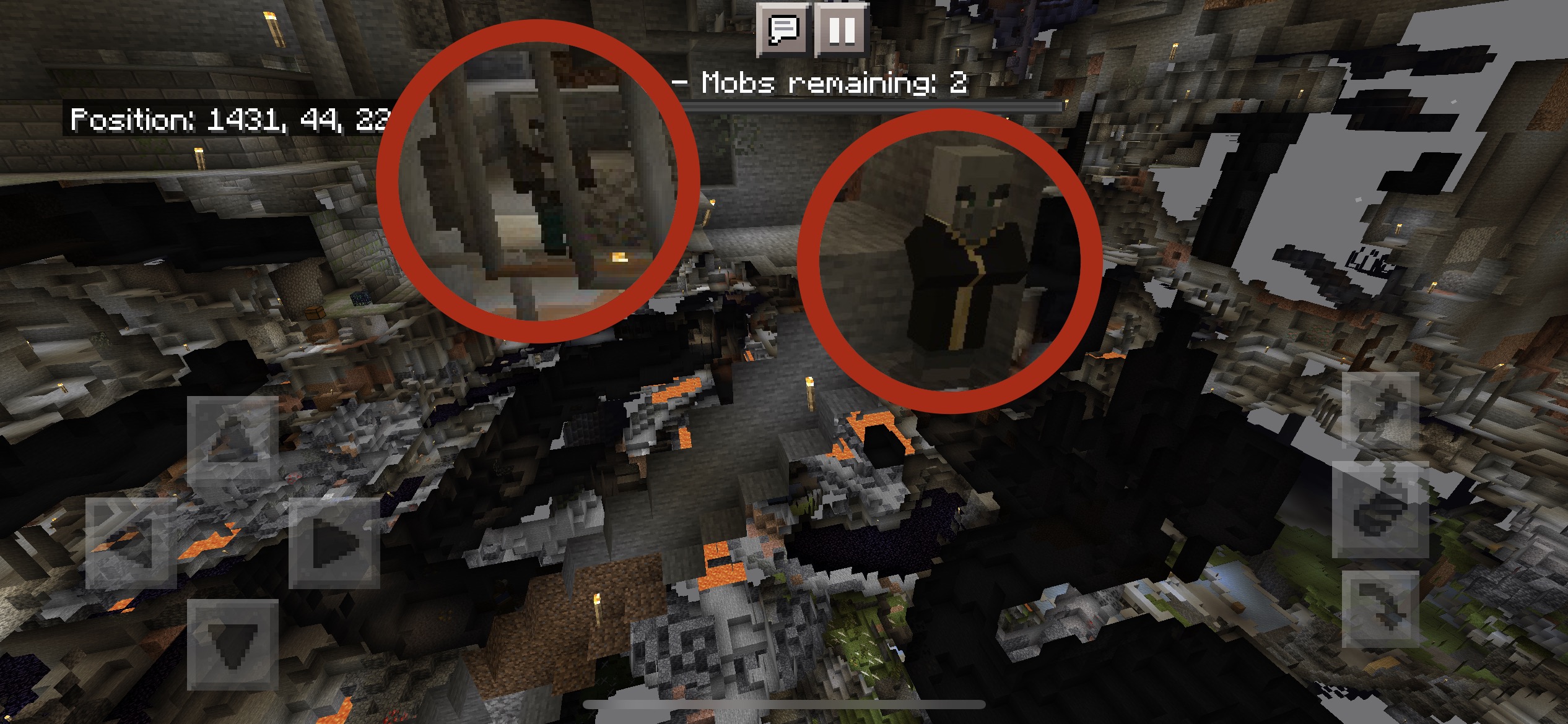 Below I’ve attached a screenshot from the spectator version of the world, where an evoked and illager have spawned underground. I’ve circled and magnified them.