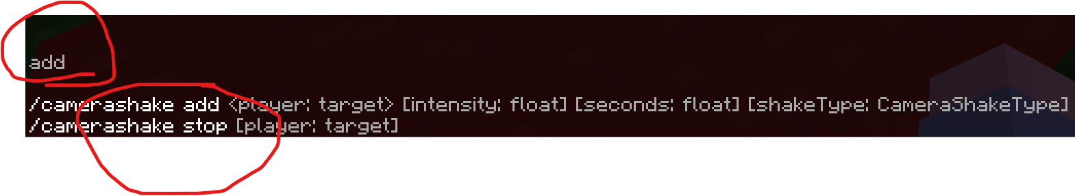 So in command /camerashake on bedrock edition there is a bug that you can see down on the picture you can see add and stop, but up on the picture you can see only add