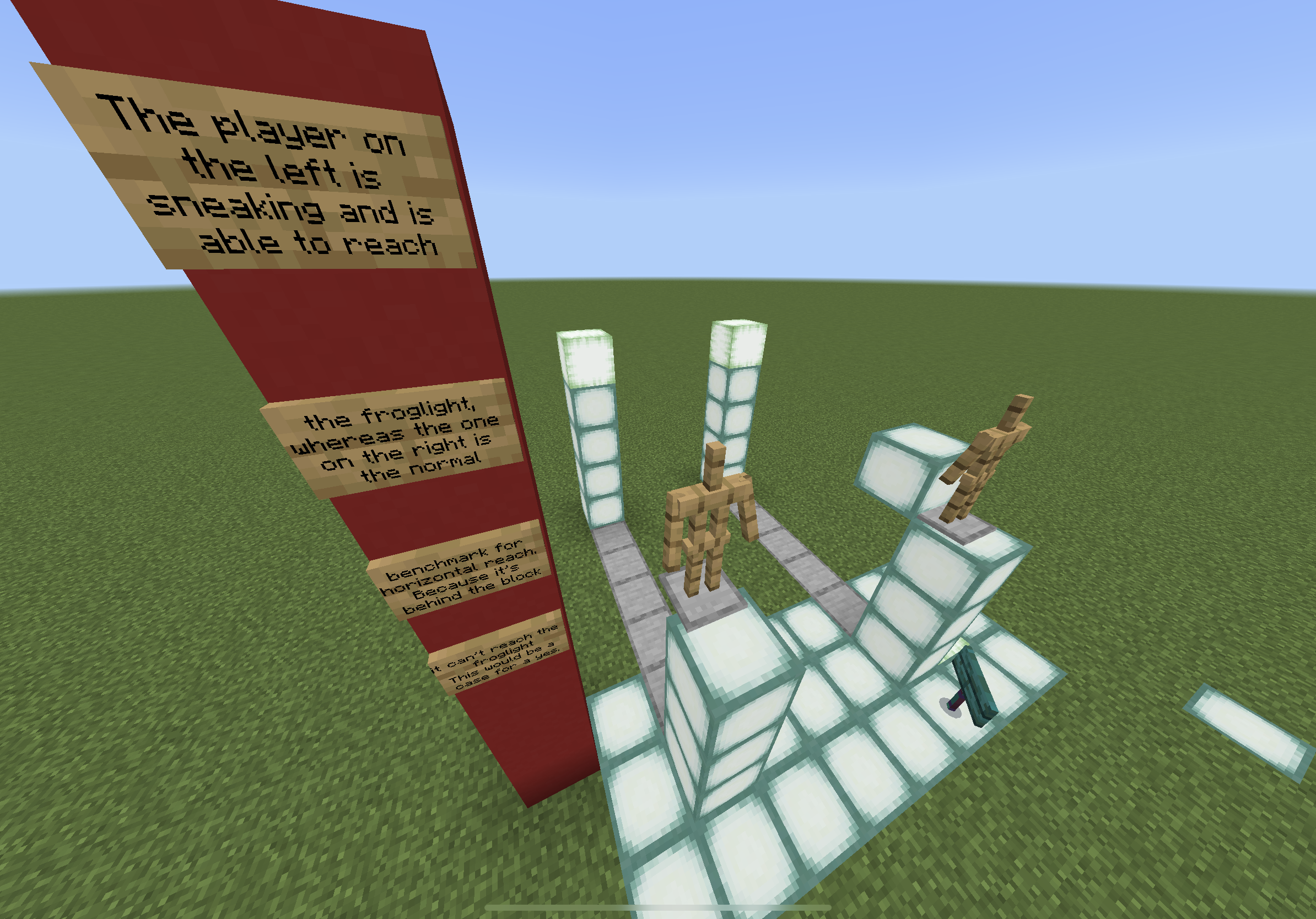 2) Open the attached world (Either in the .zip or .mcworld, they’re the same), and begin experimenting with the reach on the platforms and pillars. If you record your results to the provided definitions, you should be able to recreate the tables (Vers 1.19.51)