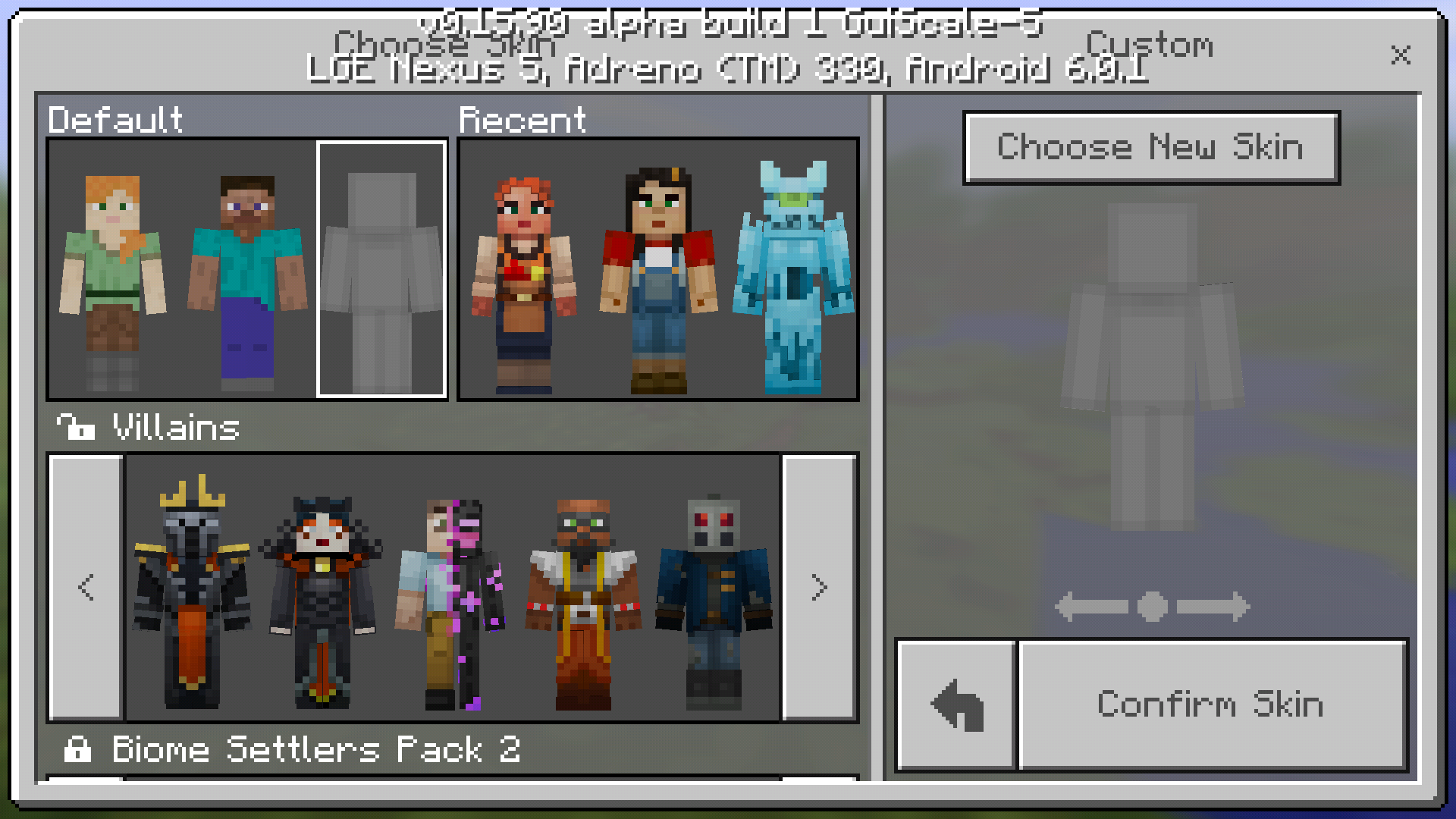Steve and Alex skins are invisible and you cannot Choose a custom skin