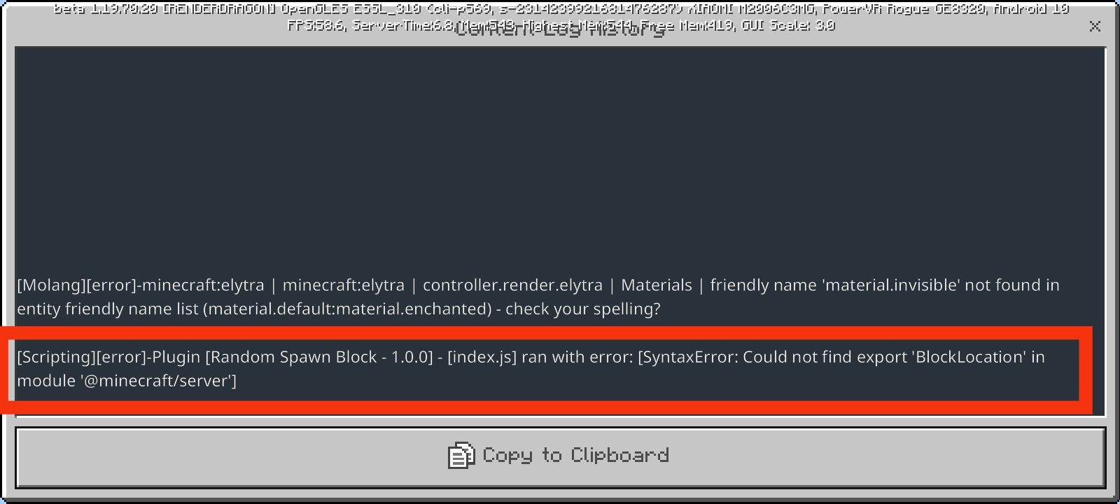 4.then try importing the BlockLocation class from the "minecraft/server" module to the index.js file earlier