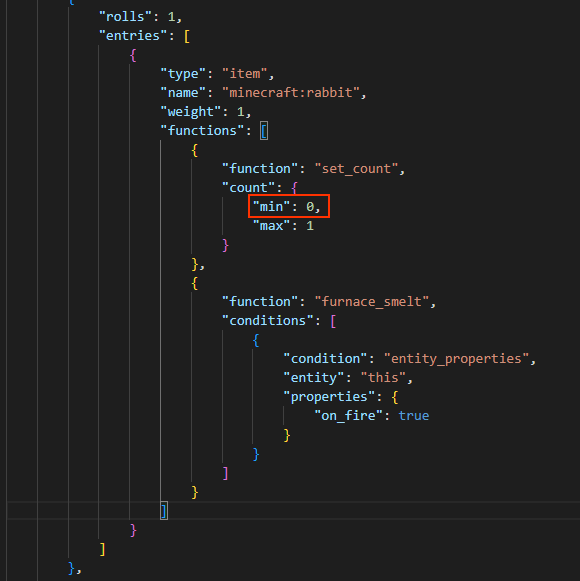}Analyzing the json file above, we can see that rabbits can drop a maximum of 1 raw rabbit (referred as minecraft:rabbit on Bedrock) and a minimum of 0 upon being killed. This means that there is only a 50% chance of a rabbit dropping raw rabbit upon death, thus resulting in this problem. Every other animal throughout the game such as cows, pigs, sheep, etc have their minimum respective meat drop set to 1, meaning that they always have a guaranteed chance of dropping meat upon being killed, however, this isn't the case with rabbits here.
