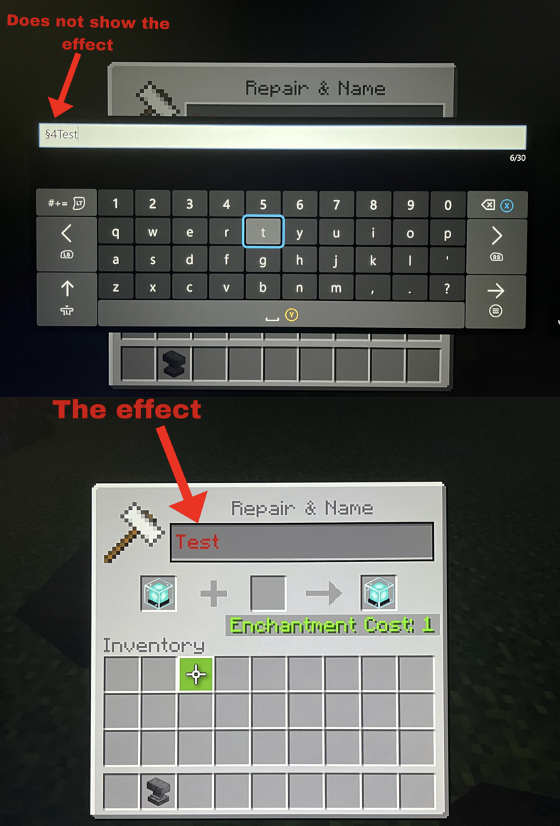 When typing in game ( such as in the chat, on a sign, in a command block, ect.) the text goes into a text bar above the xbox on screen keyboard instead of into the in-game chat bar/sign overview. This requires you to press the enter button a lot more times than needed (should be once), and because of this, it makes it difficult to edit commands and what you chat. This also makes it impossible to edit sign once you “enter” past a line. And when using the “§” character when typing it is not possible to see the effect that it has on text. For example “§4” followed by text should make text red, but you are unable to see this.
