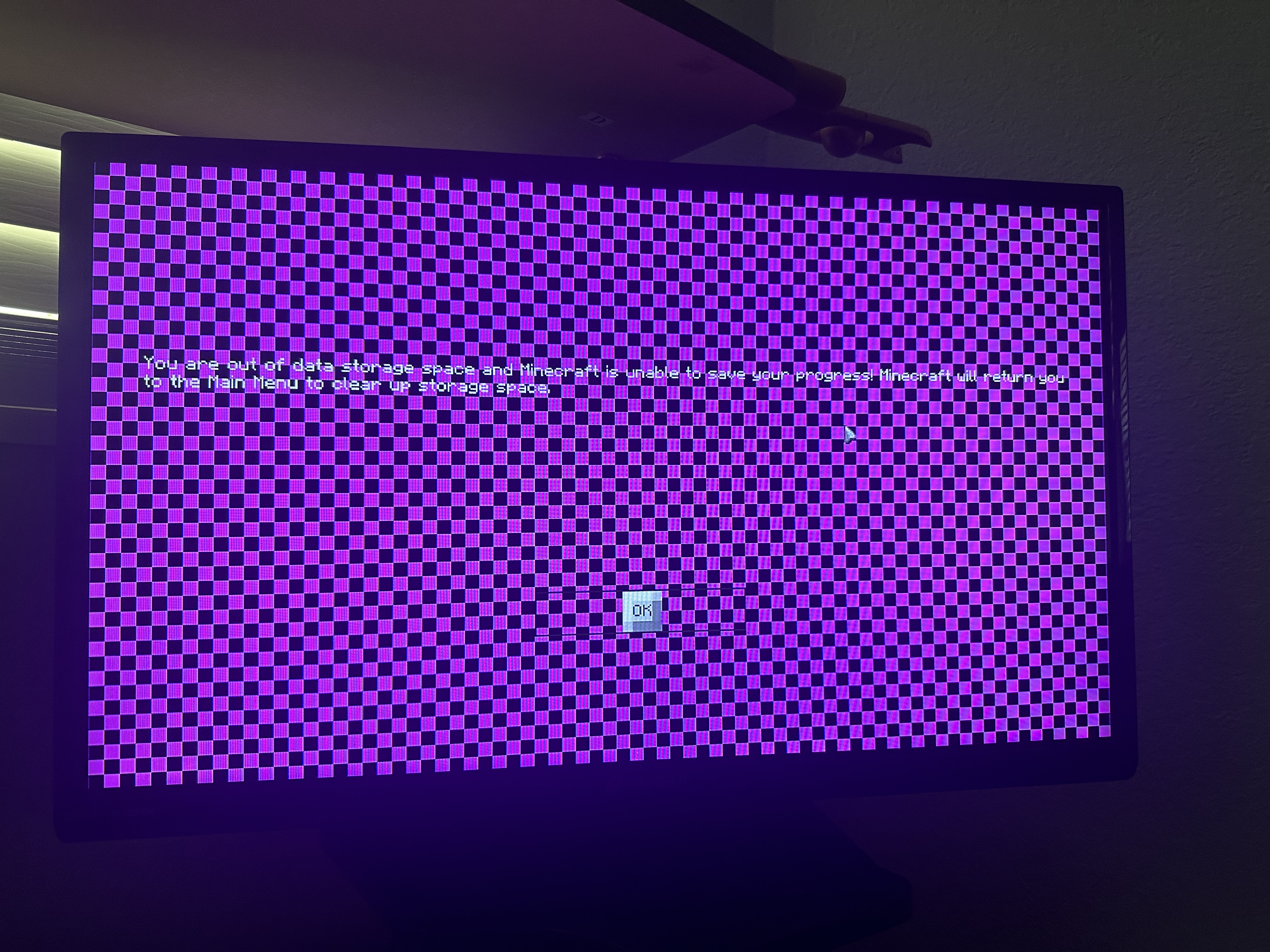have been trying to play my main world for weeks but every time I get on I can only play for about 15min till this purple and black checkered image appears, claiming that I am out of storage space and cannot save my progress, I have tried to delete worlds to make space, reset the game, delete and reinstall, and hard reset the console, but none of these help the issue. I was told my Minecraft support to report this issue on this bug tracker site to resolve the issue