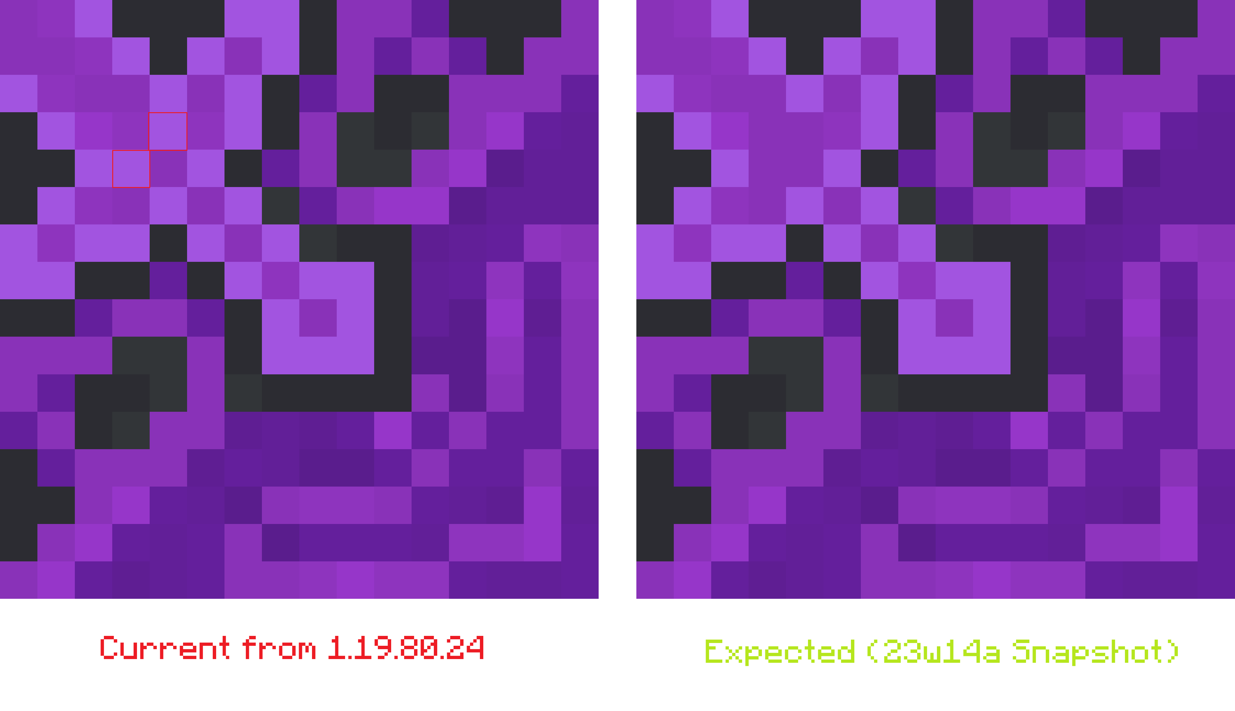 Comparison of purple glazed terracotta texture which expecting to copy texture from 23w14a Java Edition Snapshot.