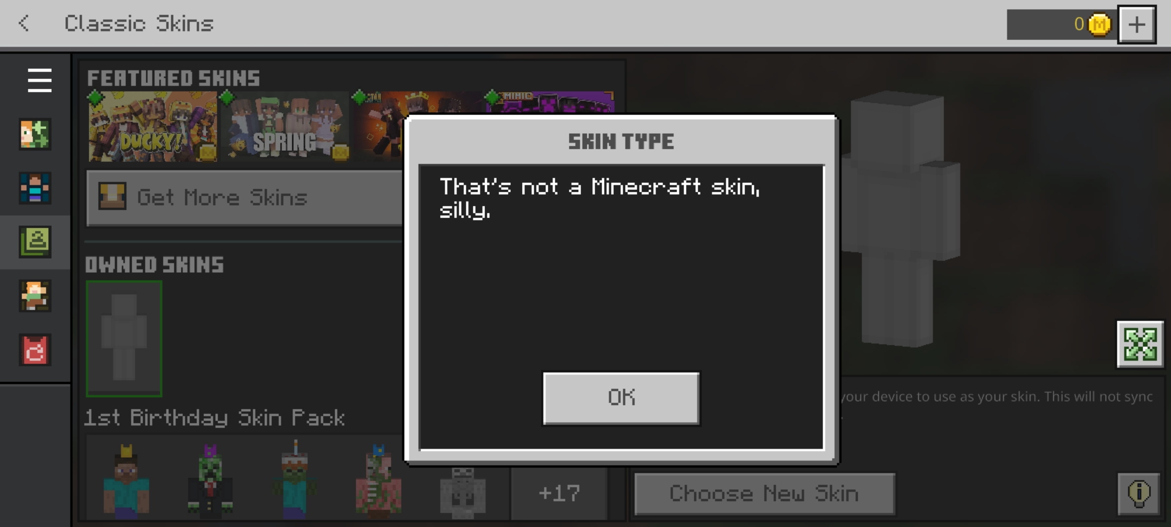 After using a custom skin I made in blockbench, every skin I try to import is "not a minecraft skin" despite working before I used the blockbench skin.