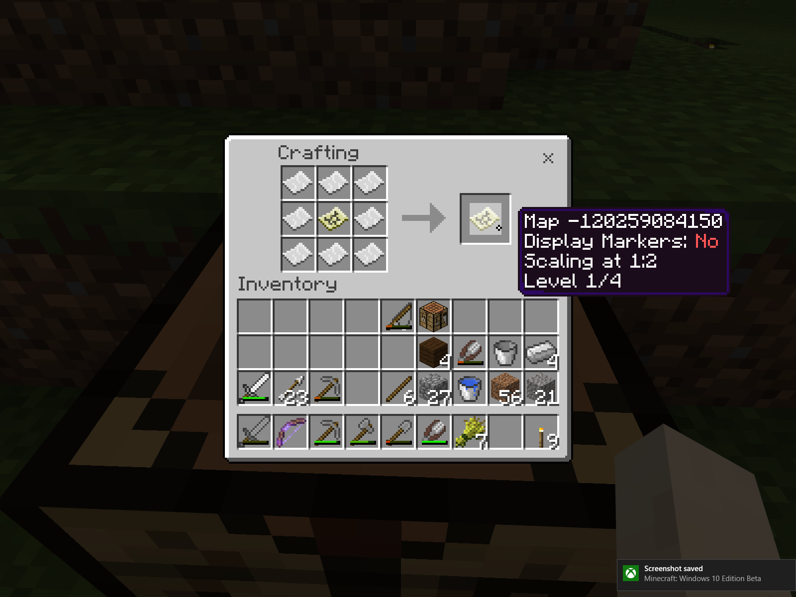 So I tried this again, with a marker-less map at first. Starting from the second screenshot attached to the bug, first I got this fully-explored map at zoom level 1. Then I zoom in once, while it was weirdly aligned, there was no apparent data loss. Then I fully explored that one as well, shown in screenshot 5. However, zooming it the second time, the loss of the map data is visible. Notice the large swamp- lake in the map, after zooming out it is no longer visible, indicating the data is lost. The only visible area is the area that would be normally visible when using an empty map with the same scale. Other screenshots show the ids and crafting recipes as I've applied them.
