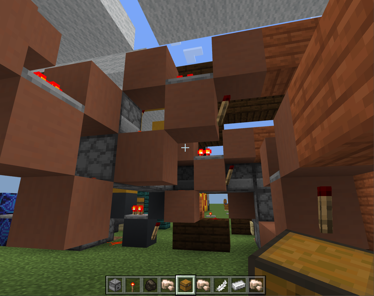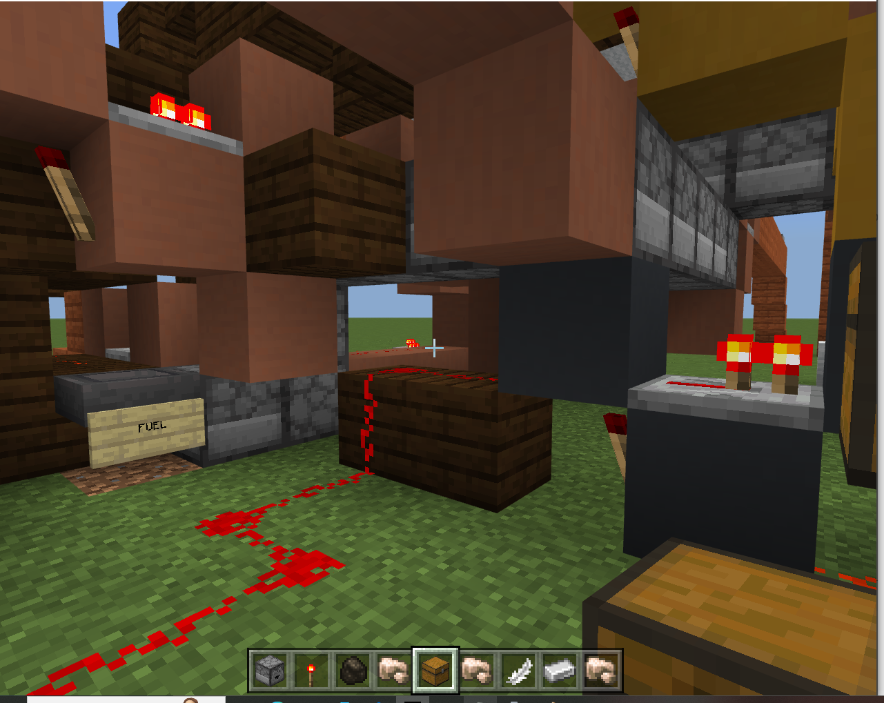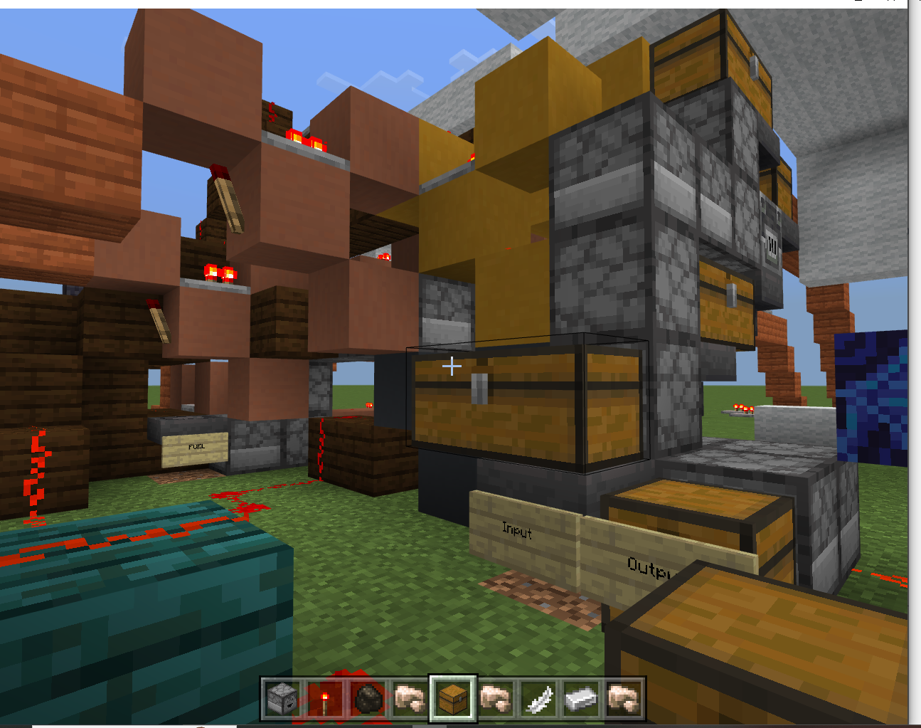 The Fuel line has 8 Redstone Clocks and 15 droppers. The Input line has 3 Redstone Clocks and 7 droppers, and the Output line is 1 Redstone Clock with 3 droppers The idea was so that the output chest would be ground level right next to the Input chest so that the player would not have to move in order to collect the product when using this superFurnace. The Fuel line is nearby; also encouraged to be on the ground level, but is not required to be directly next to the input and output lines to simulate feeding. In this build, it is seven block spaces away from the input chest, and one block forward. While my machine does currently work, it is really large and bulky and makes a lot of noise.