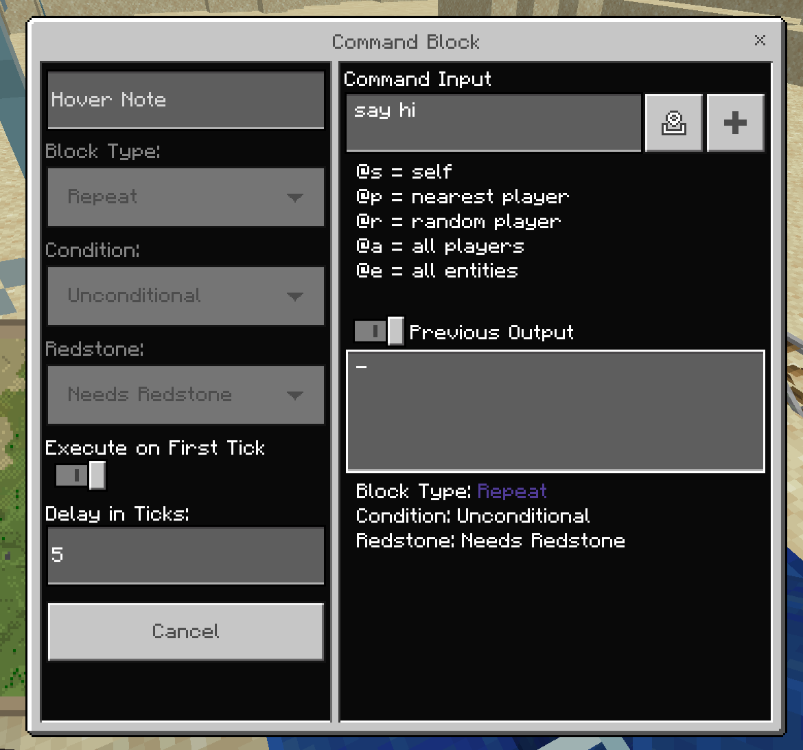 Re-opening the Command Block interface should show the previously saved values.