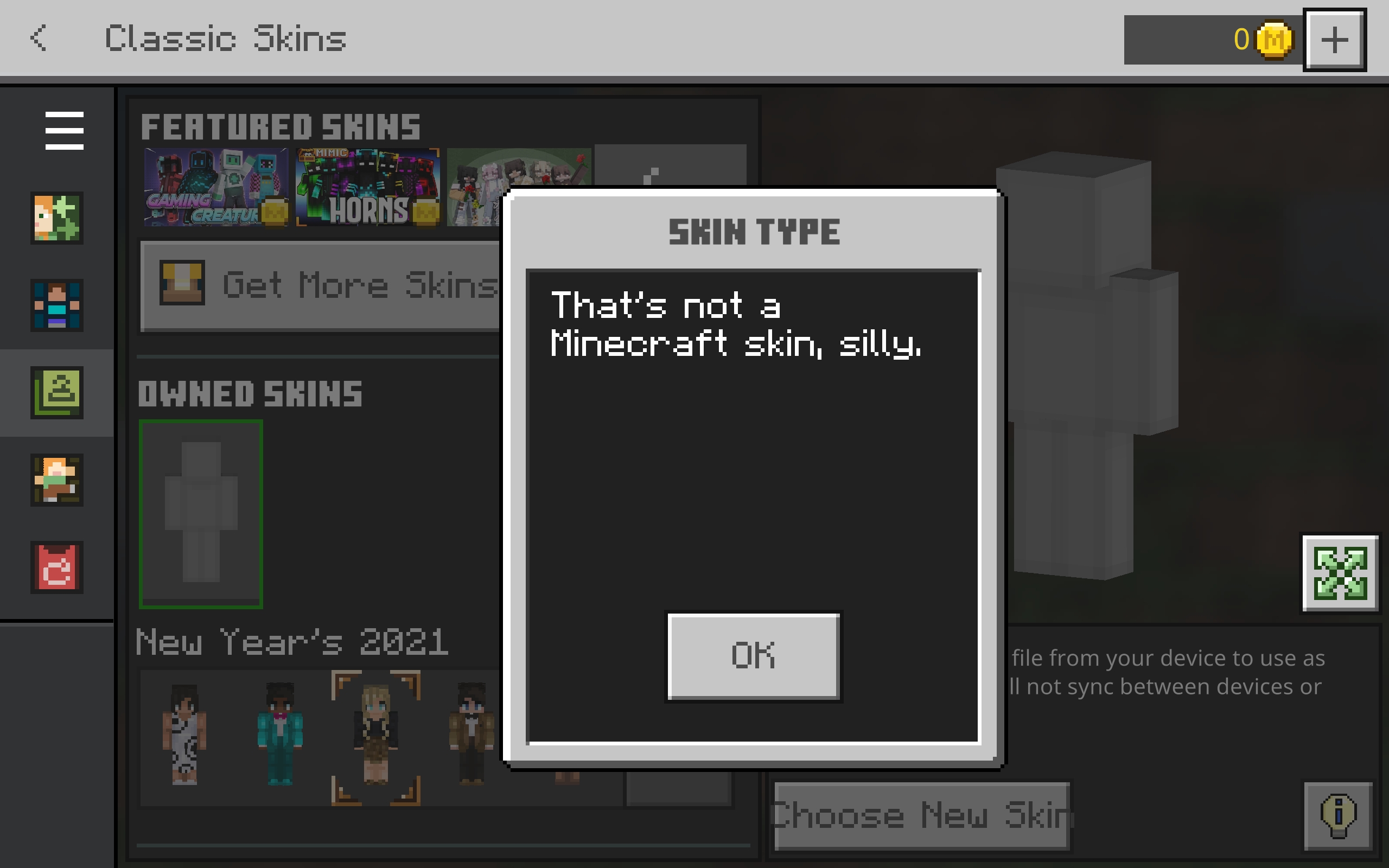 I'm not sure what I'm doing wrong since this has never happened to me. Whenever I upload a custom skin, it wouldn't apply like it normally does anymore. I've even tried reinstalling the game, however, nothing happened. Whenever I upload a skin, it would always say "That's not a Minecraft skin, silly."