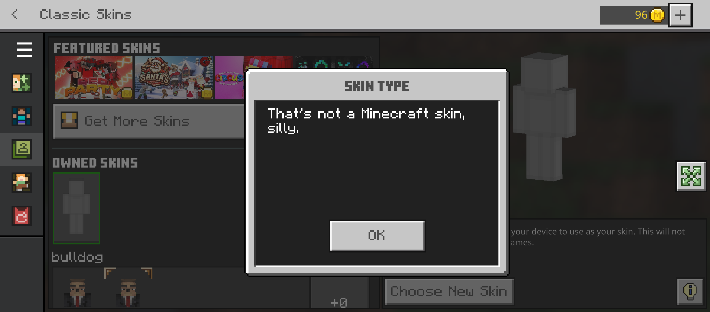 First, I tried to add skin with Google photo app (this is OS standard gallery app) and it makes the same error "This is not a Minecraft skin silly".