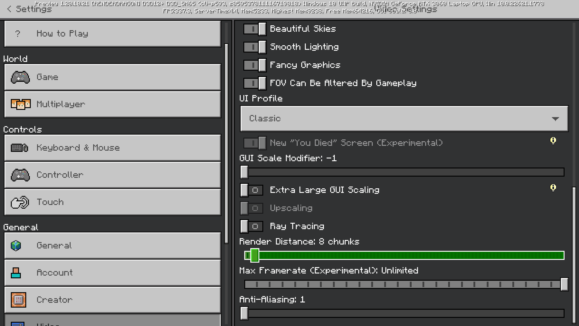 If you change the simulation distance from 10 chunks to 4, the performance increase but not much because it has fps drops constantly. Bedrock for PC needs a performance patch please Mojang… I don’t know how to fix this… Minecraft Java Edition works better even with the same chunks render distance and simulation distance. I even desactivate the antialiasing for Bedrock, and not change anything. I always loved to play in Bedrock because it always had better performance, and I don’t know what is going on right now with the game.
