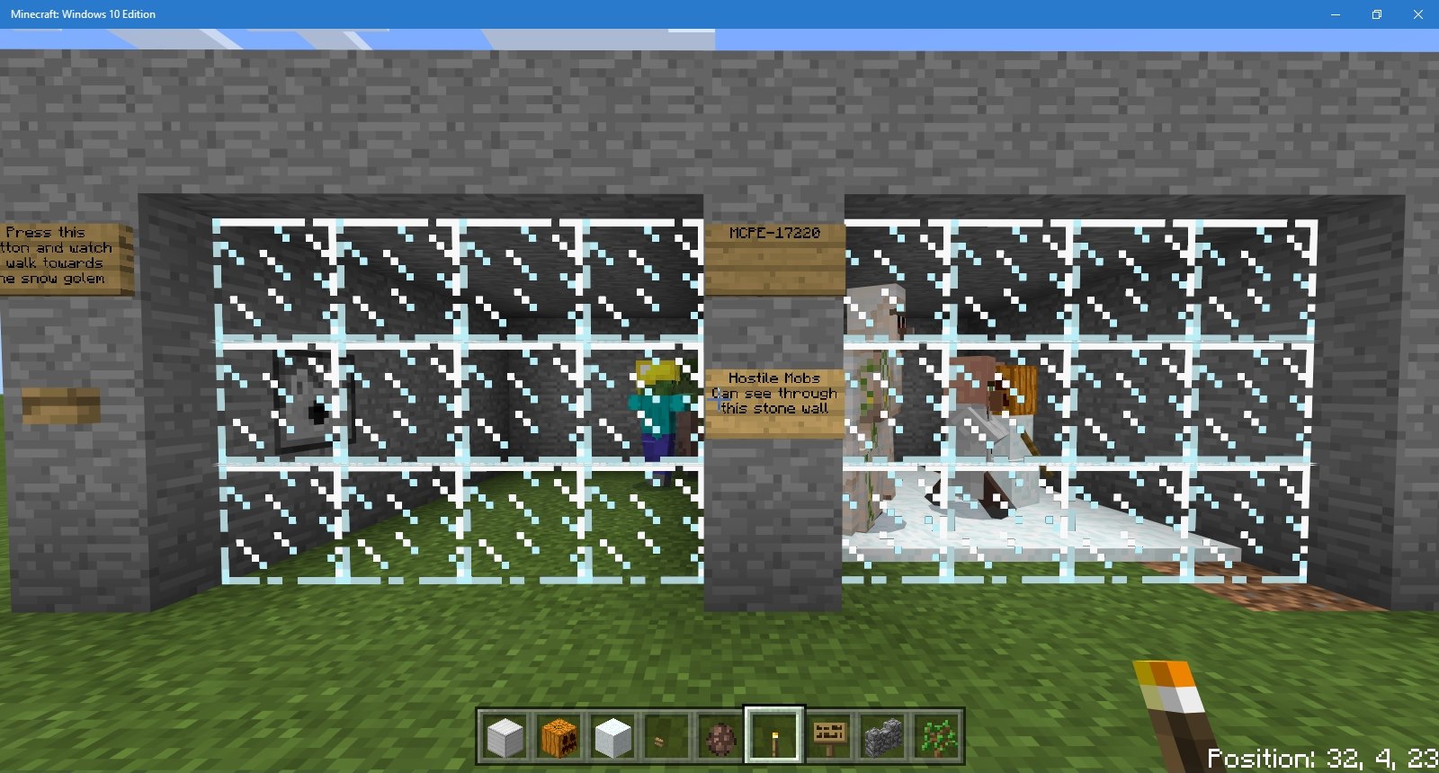 I repeated the preceding experiments with a creeper. There was no sign that the creeper was able to see me through a cobblestone wall, even after it had started sizzling, except that if I remained next to the wall it exploded but if I backed away in time it stopped its attack. But if I backed away successfully, I could come back up against the wall immediately opposite to it and it would not re-trigger unless I jumped and it saw me and started a new attack, so it can only detect me through the wall while it is triggered. I assume the reports above of creepers exploding outside a wall or door are cases where the player did not move away quickly enough after the creeper triggered.
