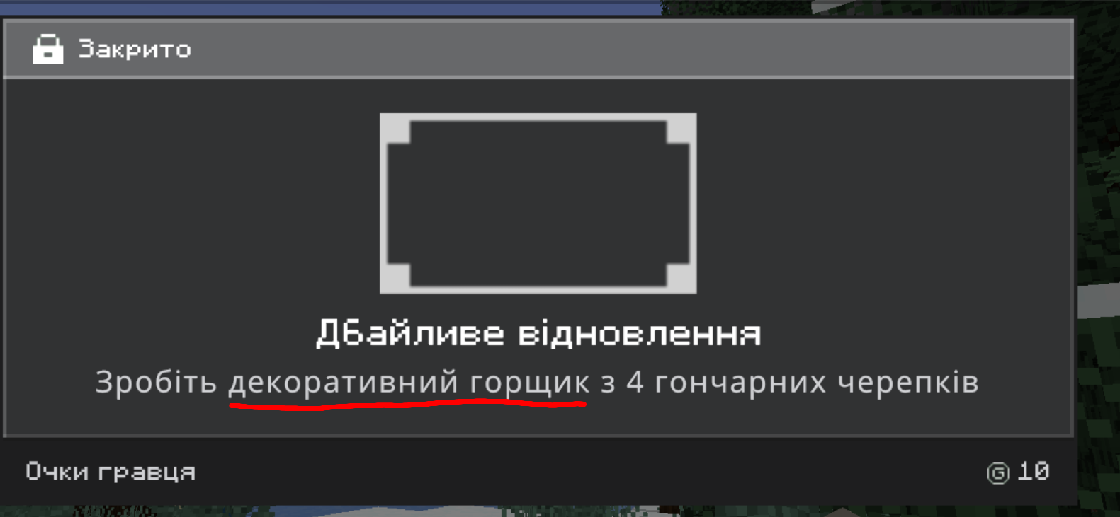 The translation of the decorated pot as a block is "Прикращений горщик" and in achievement "декоративний горщик"