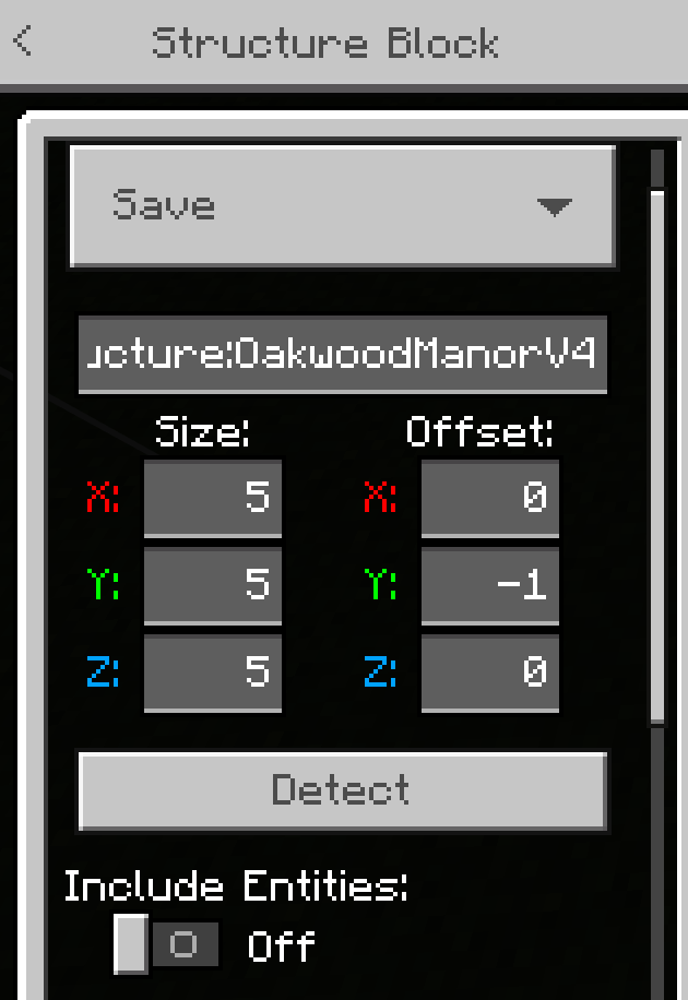 I have a world where I build my structures and two of the structure blocks that I use for buildings are detecting, but a third structure block used on another structure will not detect the corner blocks at all. I have attached my world to this ticket. It is the middle structure named "OakwoodManorV4" that is unable to detect corner blocks. The other two structures worked fine as you will see the structure block borders have outlined them perfectly.