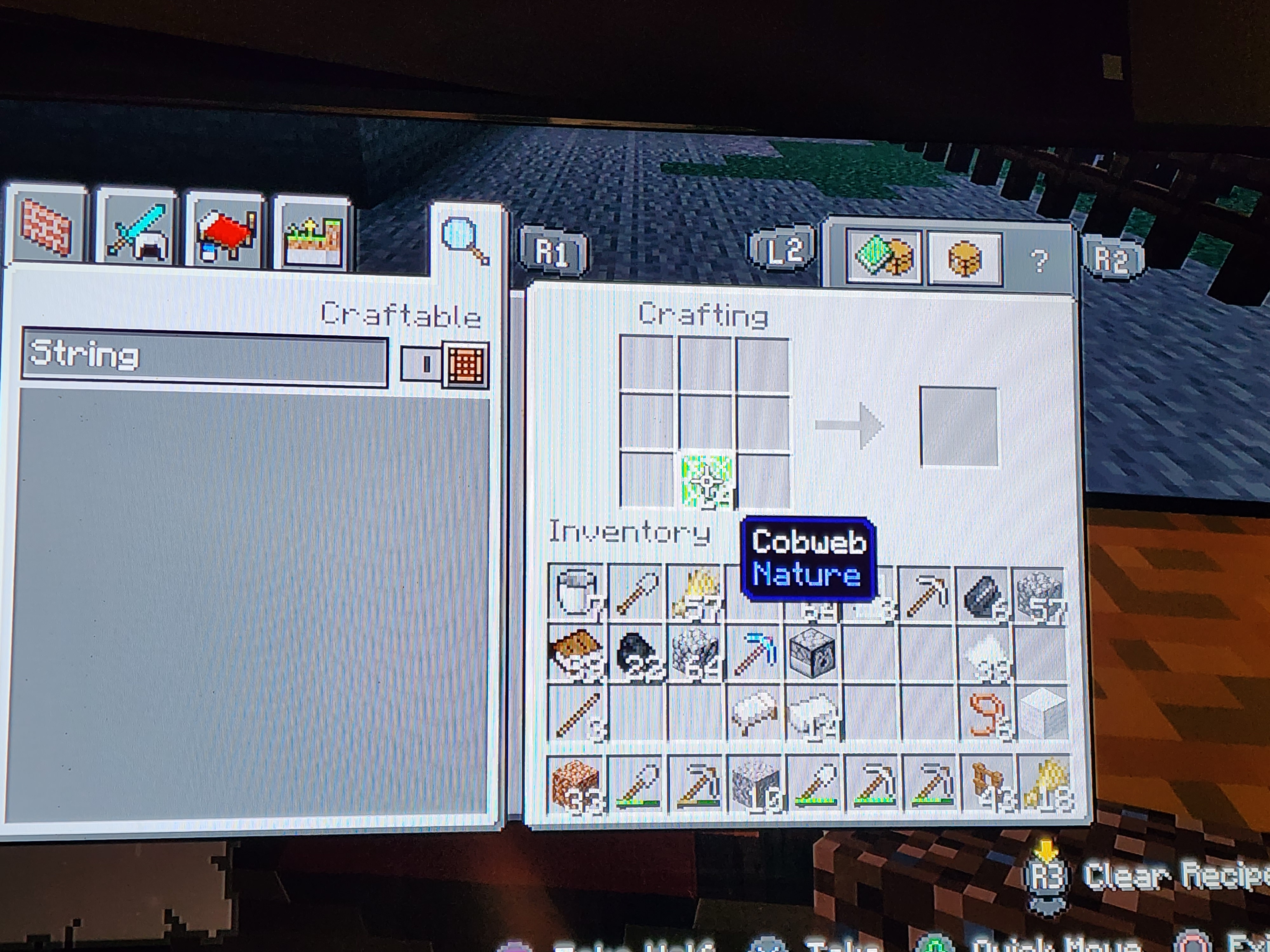 i have a stack of cobwebs in my inventory and i can't make string to make beds or bows/dispensers to build.. tried using the crafting table and the loom i have done it before with the crafting table i even tried with the shears in my inventory, i tried placing the cobwebs and using shears on them to refresh. nothing worked on the ps4 version