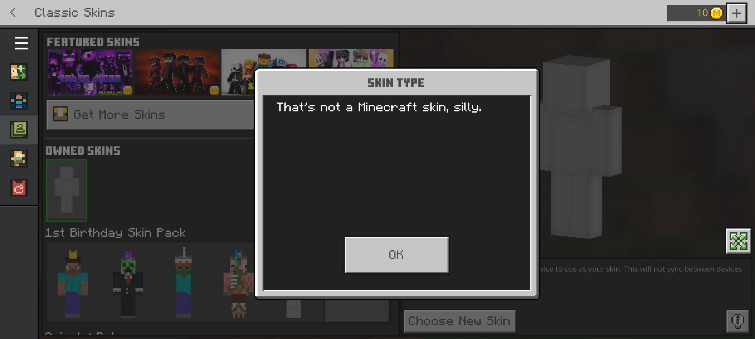 When player taps on skin file, it says it isn't a skin silly, so can't use previous skins. When downloads another skin it also states the same thing.