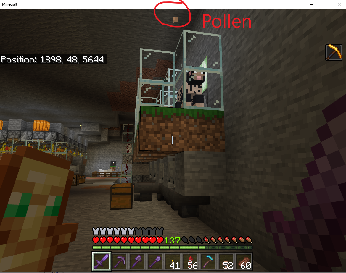 I just completed building a honey farm, at y=85. Beneath it is some dirt and rock and then my storage area at y=61. After building the honey farm I noticed pollen particles falling through my storage area. Hmmm... that's odd, but ok. Beneath that is a work area, y=48. I noticed pollen still falling through the room. This is a total of 37 levels including more than 10 levels of solid blocks broken into at least 3 separate groups.
