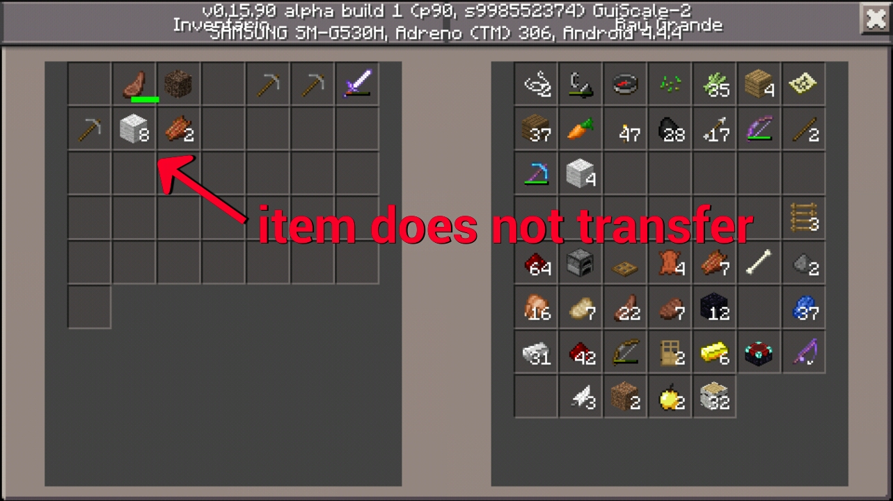 expensive developers would like to report this bug in MCPE 0.15.90.7 (0.16.0 B4) that already is present from 0.15.0, my phone is Sansung Galaxy Grand Prime, and when safe on the item to transfer it to the chest or otherwise, the the green bar carries more simply the item is still there, it is only possible to transfer the item, leaving the slot where your inventory moving (or otherwise) because the sensitivity of Mecher in the chests is very strong, in my opinion, you need to do that to get in the trunk, the alots not mecham, or launch a atualuzação so that even moving, to transfer the slot items, thank you