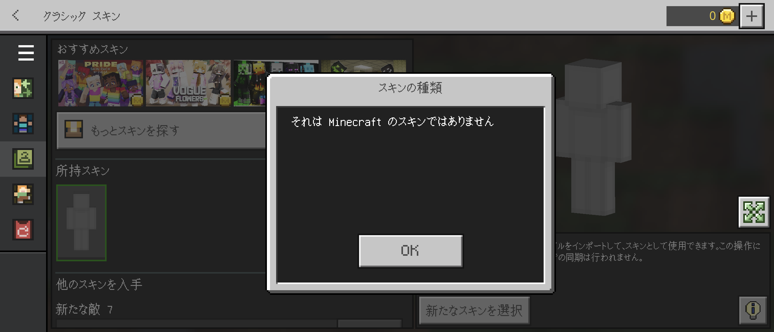 First of all, I am Japanese. When I try to change the Minecraft skin on my Android device, I get the message "This is not a Minecraft skin." This bug has been happening since spring of this year. It's happening not only to me, but to everyone who uses an Android device. Please deal with it as soon as possible.