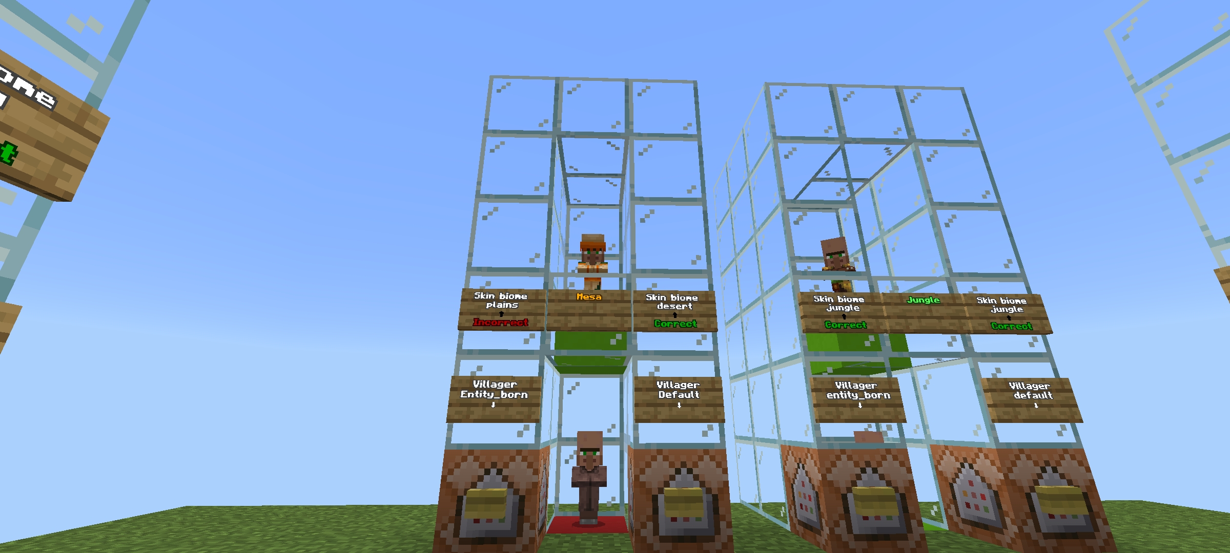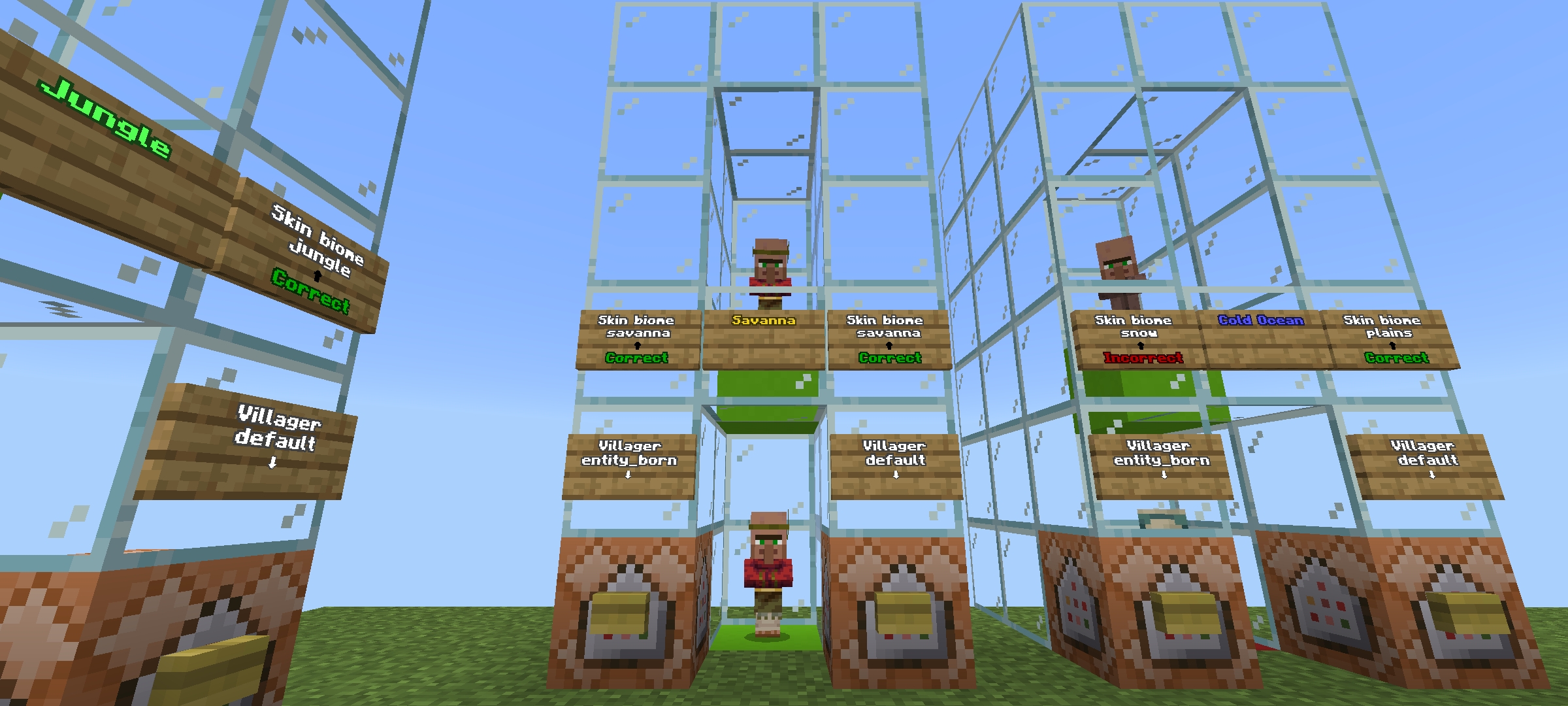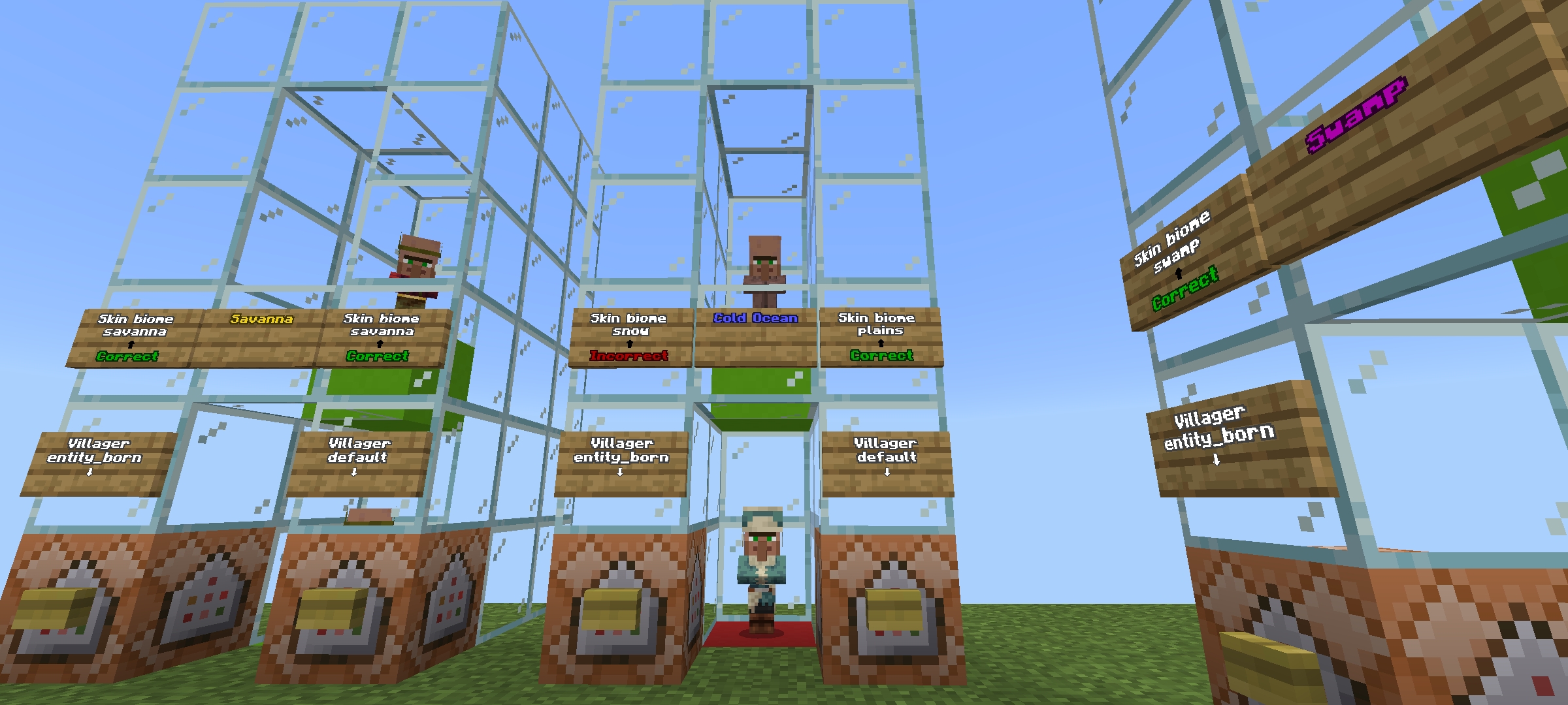 In the image, two villagers are shown, one of them, the one at the top, is a default generated villager without the born event, as you can see, it has the desert skin, which would be the correct one, while the villager generated with the born event is from the plains due to the fact that important parts of the code are missing within this being that the tabletop biome is a desert the villager should have the desert skin.