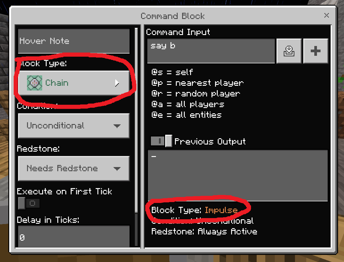 Per the Note in MCPE-71326, the information at the bottom right, including the command block type, is part of the Previous Output, so please do not consider that when determining the new command block type.