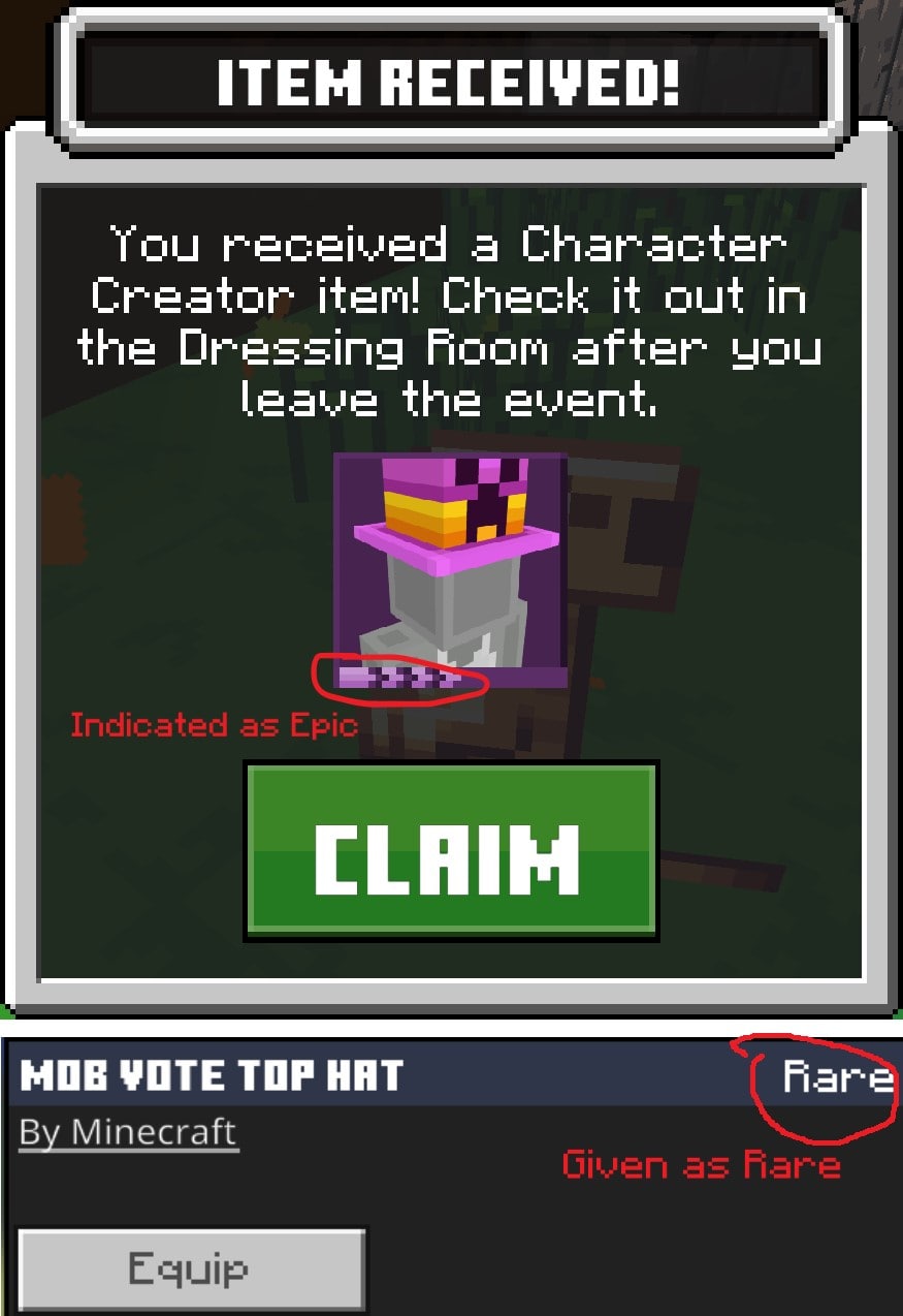 In the Character Creator/Dressing Room, all of the Mob Vote 2023 items besides the cape are a rarity lower than what was shown on the Mob Vote server. The item earned from voting such as the Penguin Hat was shown to have a rarity of Rare on the server, but the Character Creator shows they are only Uncommon. Furthermore, the Mob Vote Top Hat was shown to be an Epic rarity but it is only Rare in the Character Creator. To simplify it, I have made a table below of the rarity comparisons.