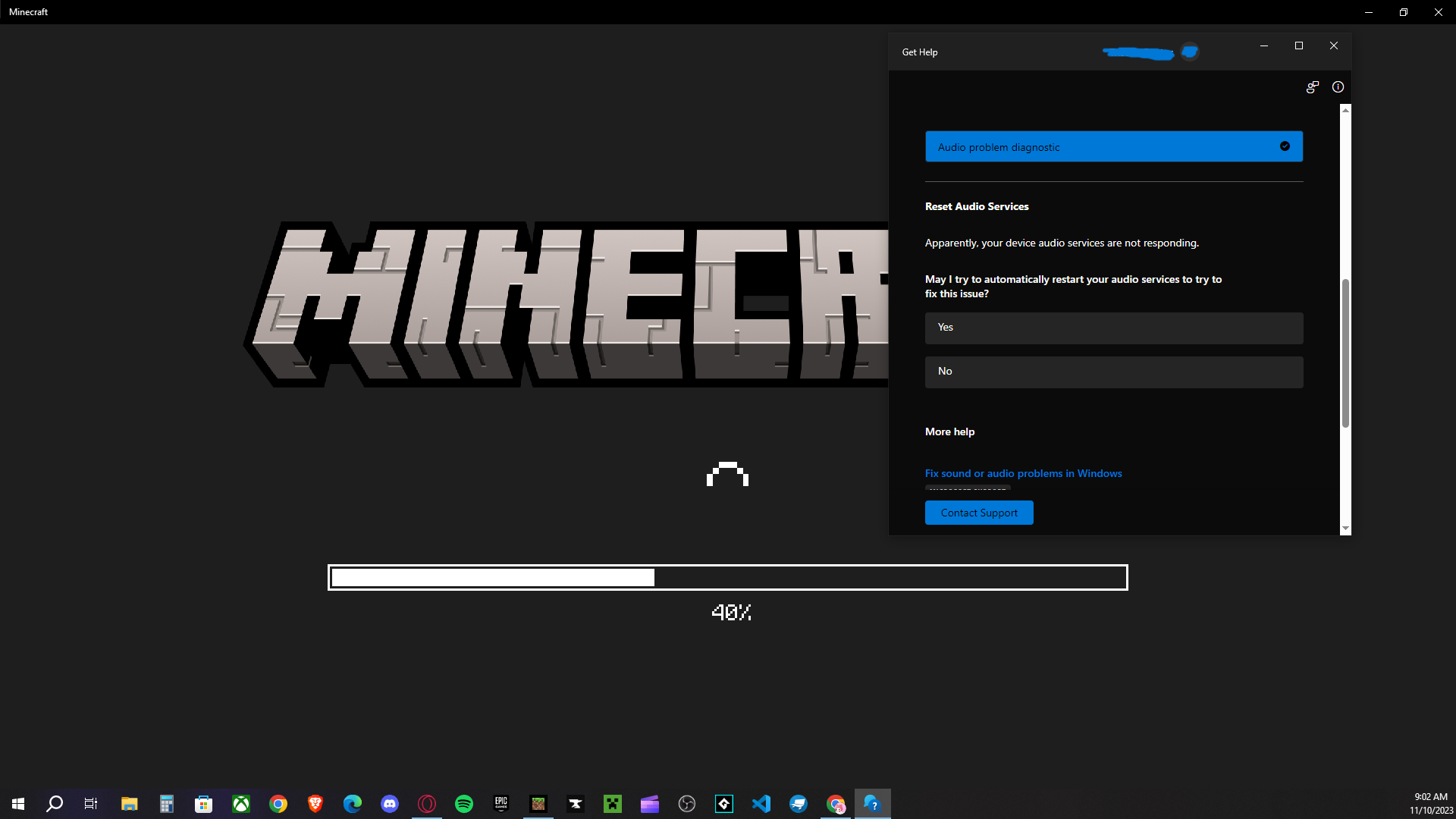Every time I load up Minecraft, the loading bar gets stuck at 40% and all the sound on my pc stops working. Minecraft only continues to load when I use Microsoft's sound troubleshooting to fix the sound issue.
