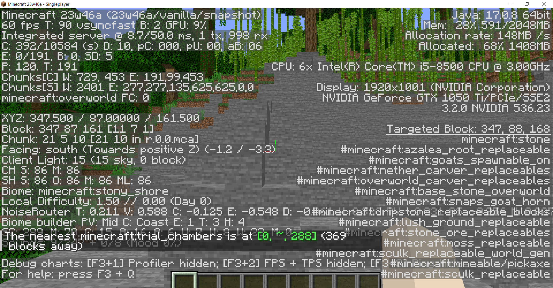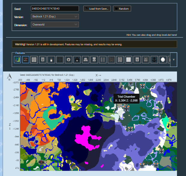 Nearest Trial Chamber to spawn is almost 3x farther away in Bedrock (1051 blocks vs. 369 blocks).