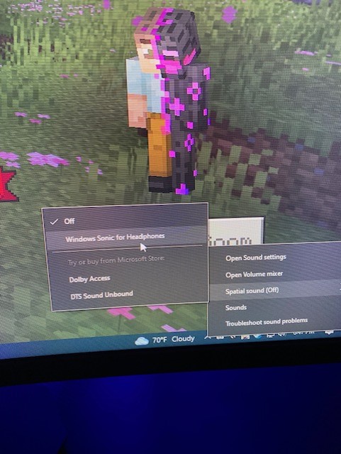 Please forgive the actual photos of my screen rather than the screenshots, but I wanted to include them just for an example. I was texting with a colleague to try to troubleshoot the issue, hence the photos. You'll note that while Minecraft is running, it appears to want to default to Windows Sonic for Headphones for some reason, and only after manually turning that back off will the audio work again.
