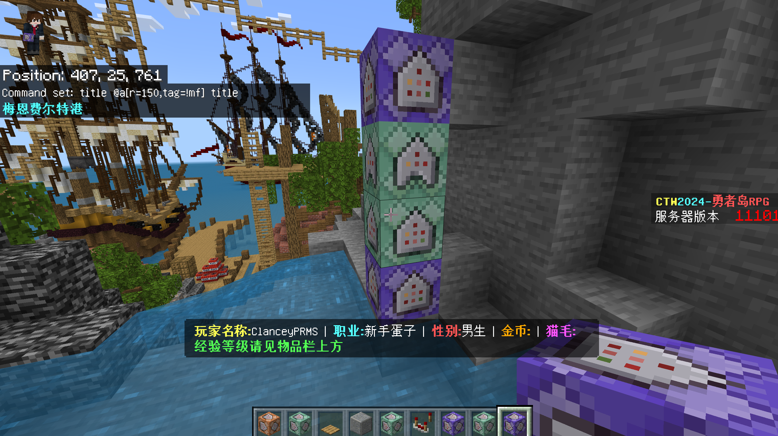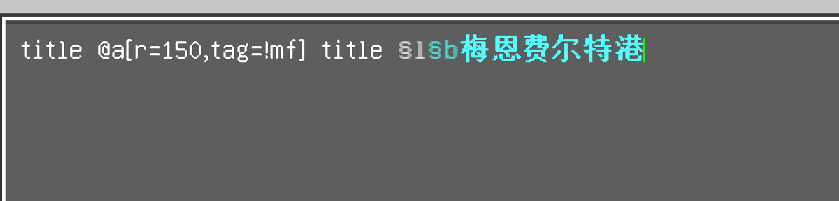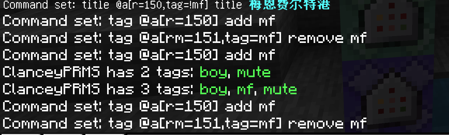title @a[r=150,tag=!mf] title §l§b梅恩费尔特港following by an unconditional chain block that is always active: