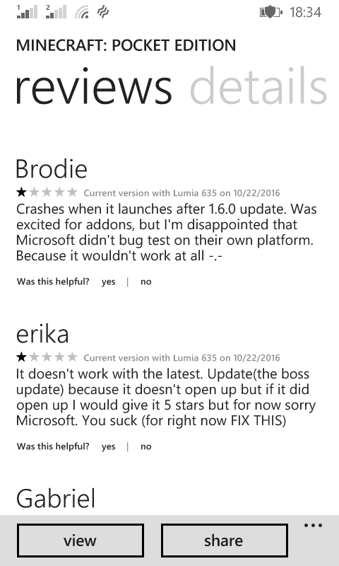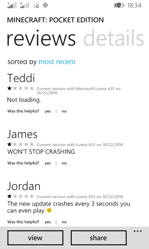After opening Minecraft:Pocket Edition for Windows Phone it crash. You can press any button, but after pressing, game crash. Fix it. I attach a screenshot from Store, where users report about this bag