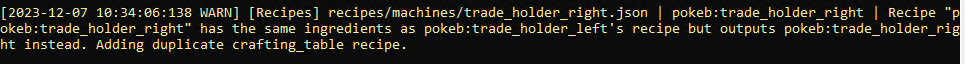 The error I'm receiving is reporting that I have created a duplicate recipe, however I have not. Because both of my recipes are shaped, they should not be causing this error. I'm guessing this is a bug because Minecraft should allow these recipes to exist.
