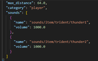 In the sound event "item.trident.thunder", the field "volume" is located in the root of the sound definition, instead of in each sound entry. This sound event is defined in the "vanilla_1.20.20" resource pack.