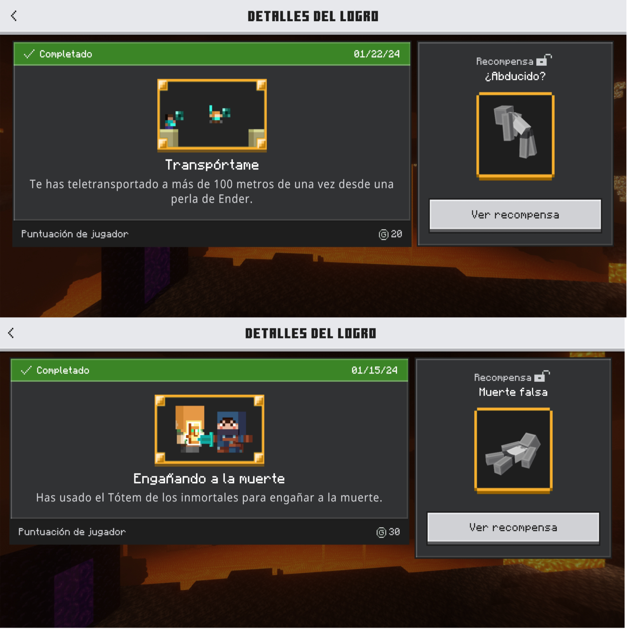 My problem is that when doing certain achievements which as a reward have some emotes for the character, they do not give me the emotes, for example, in the screenshot you can see the emotes I'm talking about. And you can also notice in the other screenshot that the achievements were made and completed, the notification even appeared that the achievement was made at the moment; this already happened in twice, first with the achievement which is about using a totem of undying And the one about using an enderpearl to teleport 100 meters (blocks), Those two are rewarded with the emotes I mentioned. If you can resolve it as soon as possible I would greatly appreciate it, and also thank you for your help.