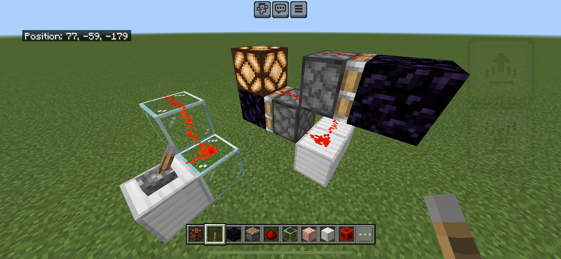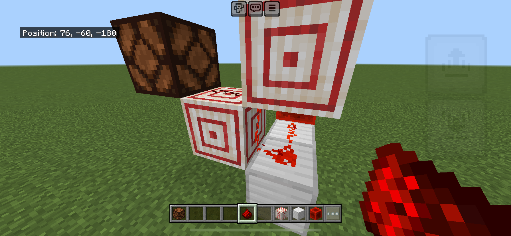When a redstone ladder is made out of Target blocks, a non transparent block, the redstone texture is visible on the vertical of the target block as if it can transfer the redstone signal as seen in IMG_3333. This is only a visible bug, not functional. Additionally when such a ladder is built with piston, the dust texture isnβt on the side of the block as seen in IMG_3333. The glass is for reference how the vertical dust should look.Β