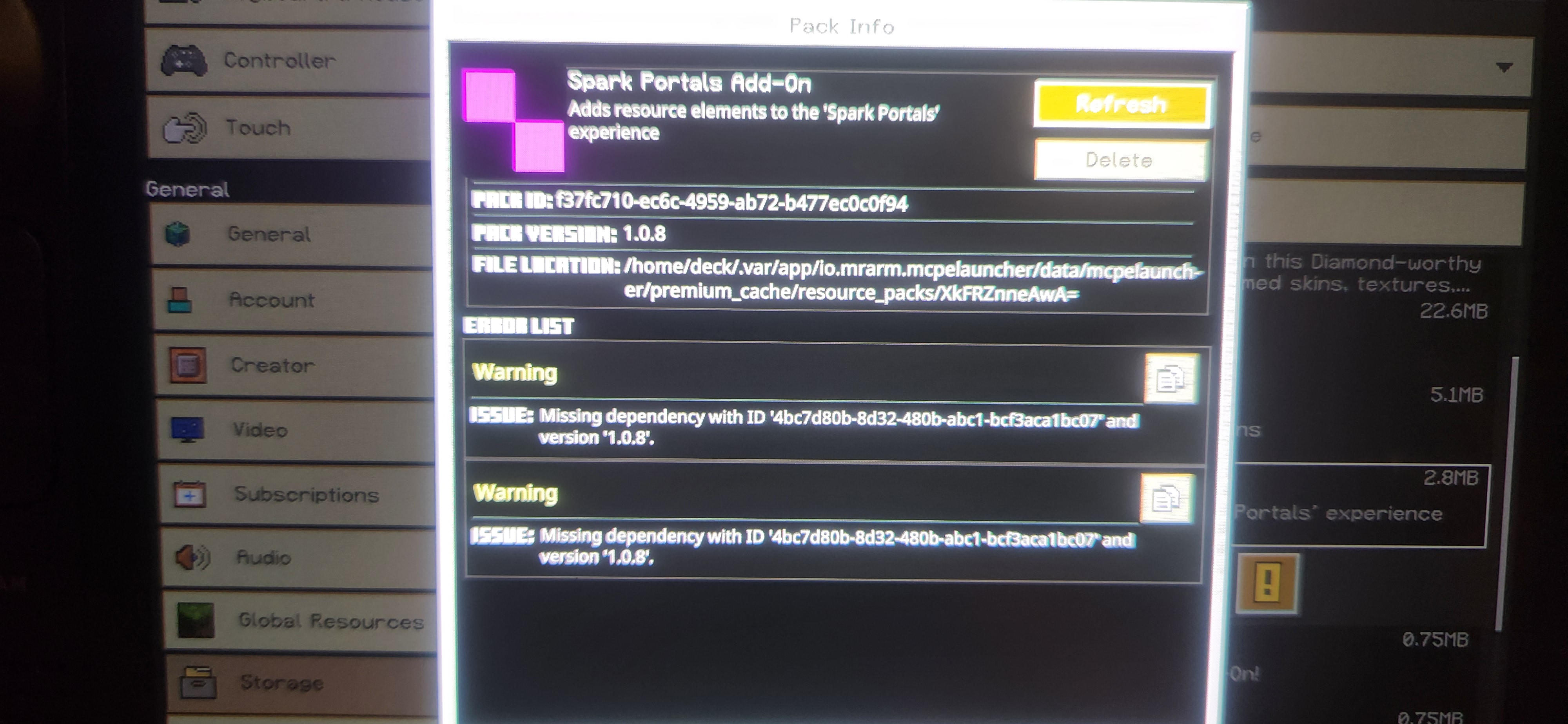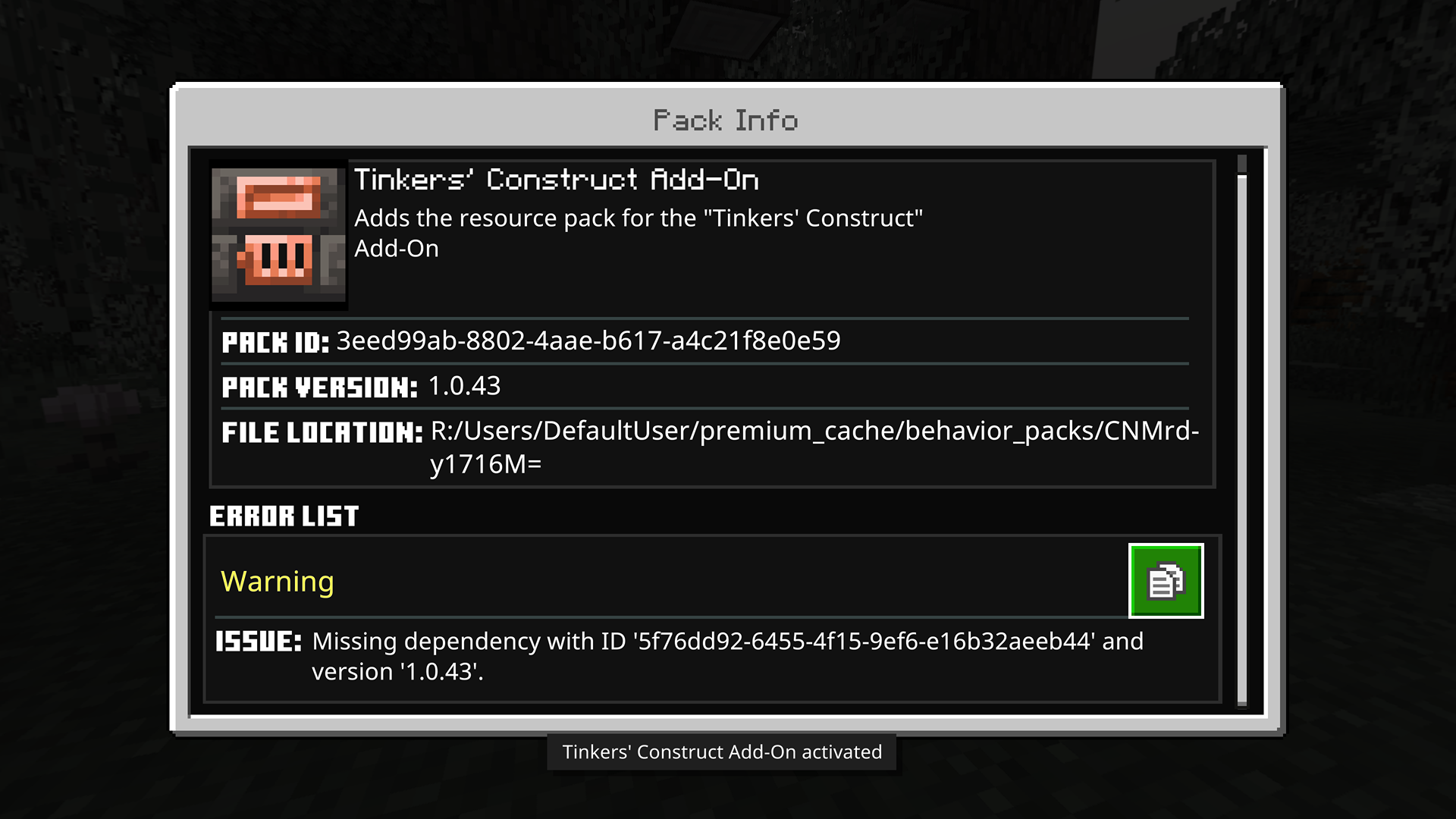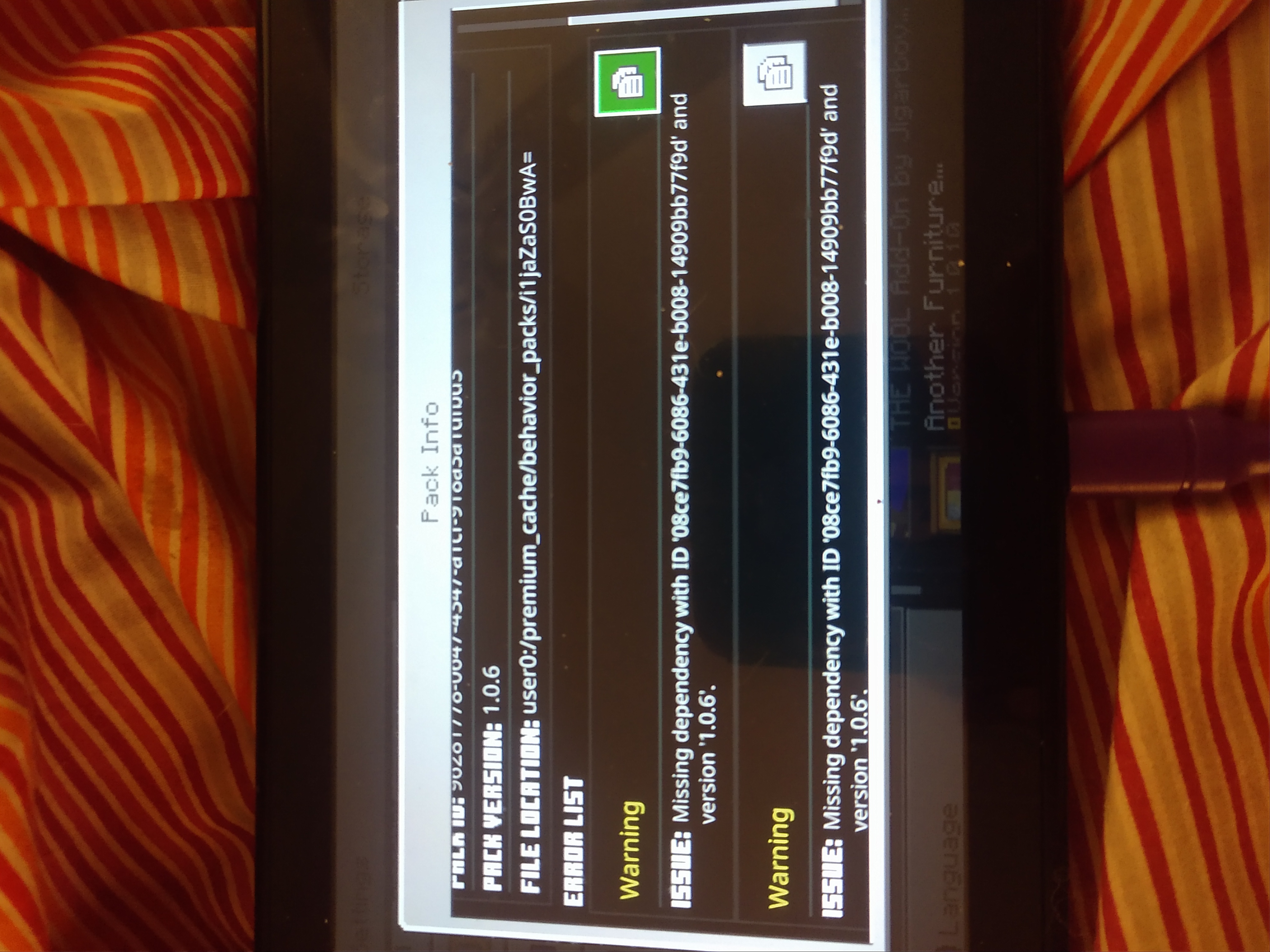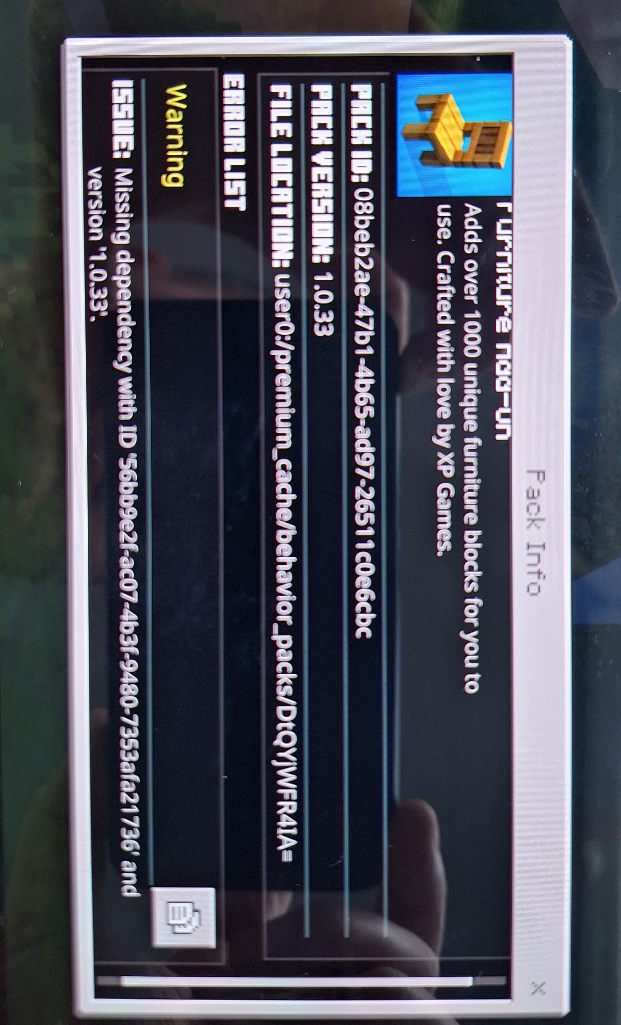 as well as the packs showing active in settings but no longer functioning/displaying elements in worlds (creative menu & where previously placed/spawned)