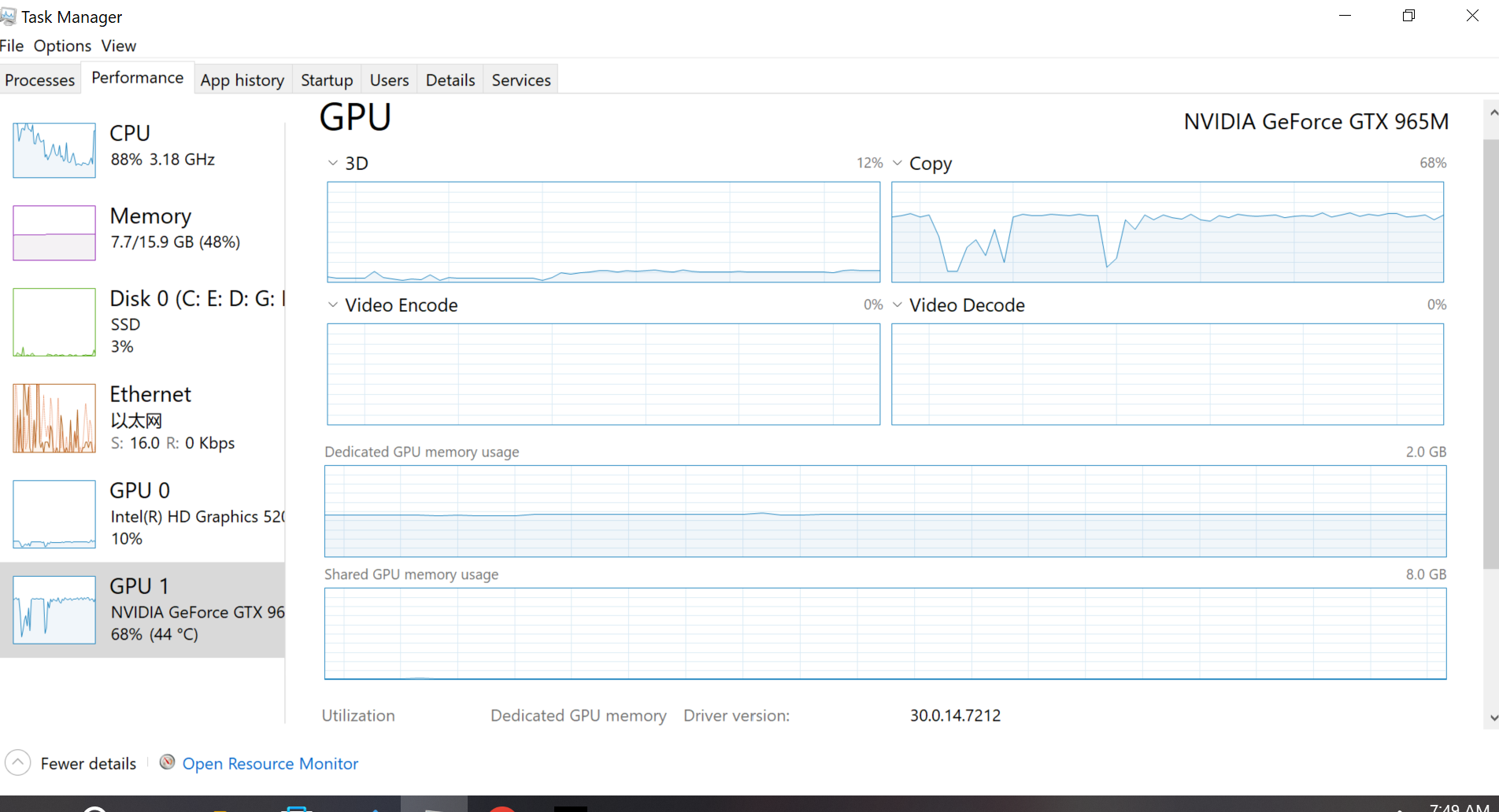 When running this application on my computer with Nvidia GTX 965M graphics card, it appears to be very laggy. By using task manager, I figured out that the utilization of dGPU had never reached 100%, but stuck at 55% just like a pool of peaceful water.