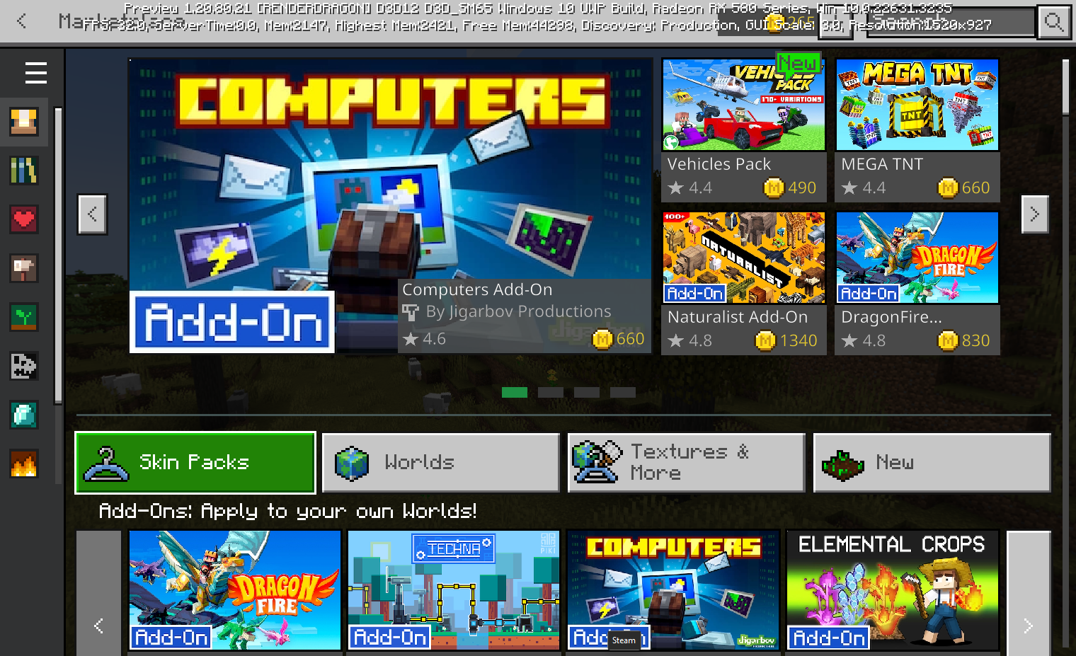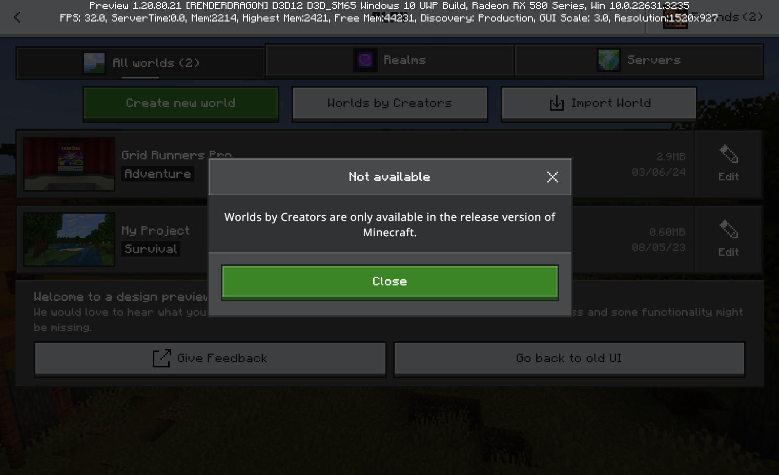 The "Create from template" button in the new UI gives an error saying "Worlds by Creators are only available in the release version of Minecraft." This is an oversight, as the feature is available on Minecraft Preview for Windows from both the old UI and via the Marketplace.